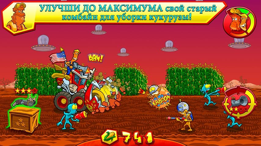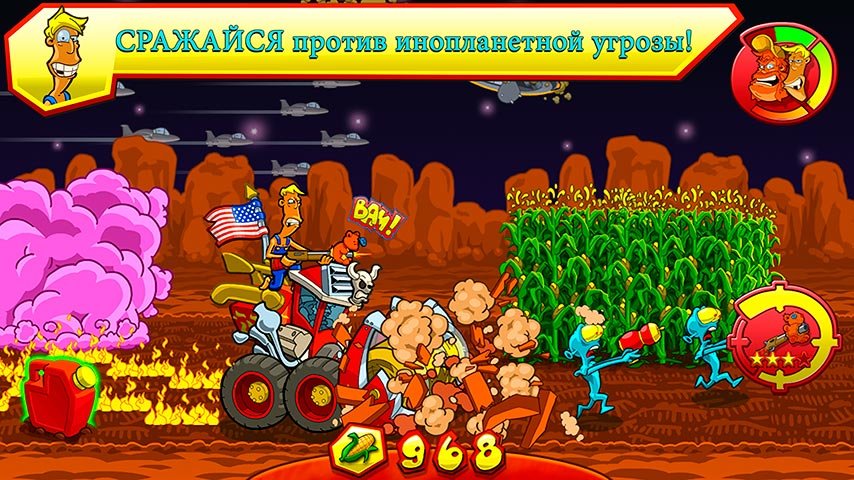 Выполняй задания, направленные на защиту своей фермы от инопланетных захватчиков. В вашем арсенале будет оружие, собранное во время нападения буквально на коленках. В Вторжение на ферму США с каждым убитым синеголовым инопланетянином, шанс получить засекреченную инопланетную разработку увеличивается. Защищай кукурузные поля от НЛО и улучшай подручное оружие инопланетными технологиями. Также в твоем арсенале будет бешеный комбайн, который поможет производить масштабную зачистку незваных гостей.