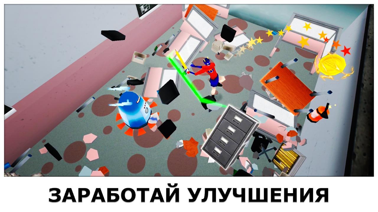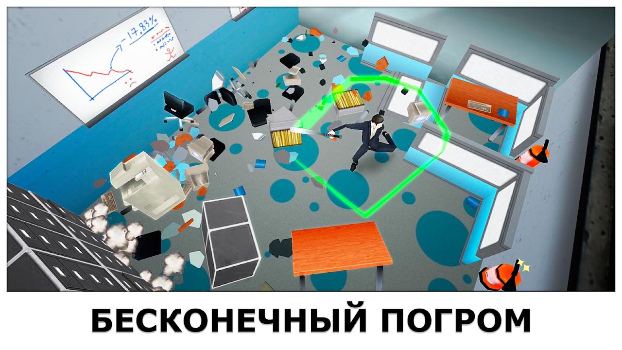 Громить офис игроки могут бесконечное количество времени, и не нужно будет себя в чем-то ограничивать. Рушьте столы, стены, оборудование и все остальное. В руки можно будет взять даже катану, чтобы насладиться погромом. Выбор оружия здесь очень большой и он действительно безумный. Например, можно взять в свои руки даже бензопилу, чтобы решить проблемы. От Super Smash the Office действительно сложно оторваться, ведь игра затягивает возможностью расслабиться и получить удовольствие. Трехмерная графика сделана в очень интересном художественном стиле. Вы будете проводить здесь каждый день, и вам никогда это не наскучит, поэтому вы вернетесь снова и снова.Информация об игре