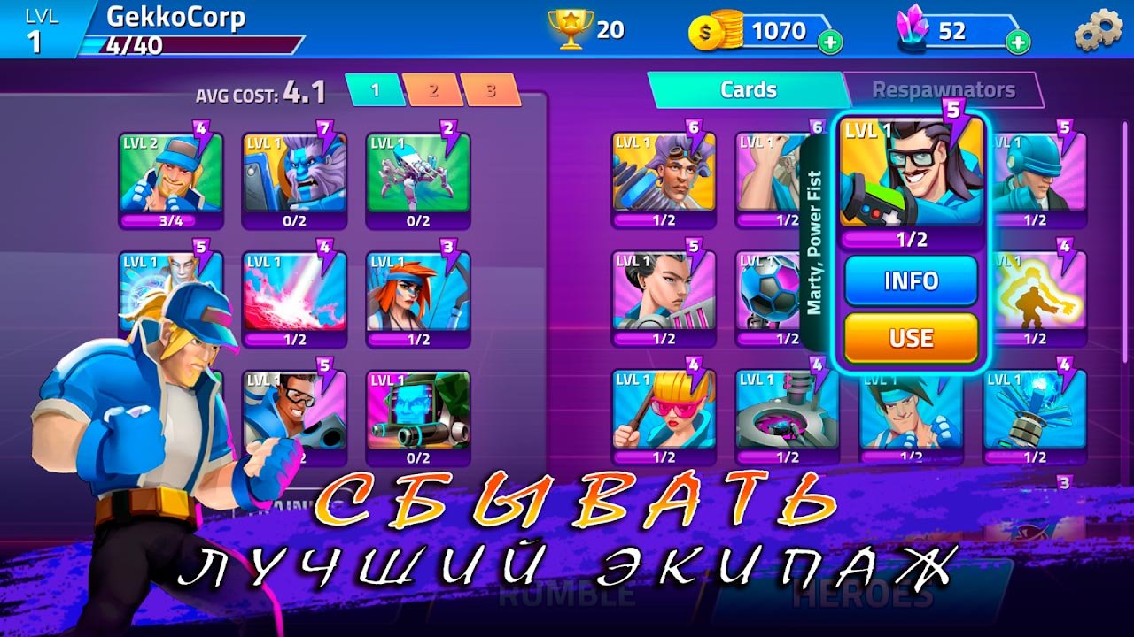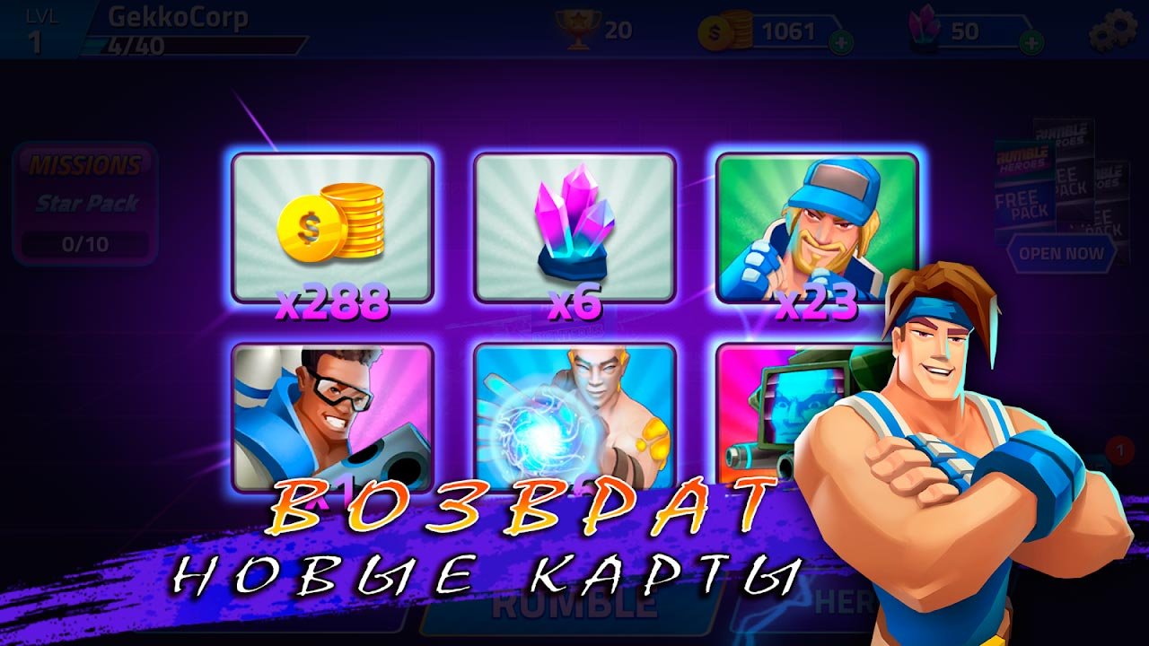 Очень красивая трехмерная графика используется в этом игровом процессе. Использовать тактику просто необходимо абсолютно каждому из действующих игроков. Игроки из Rumble Heroes могут оснащать своих персонажей, улучшать их характеристики, добиваться побед каждый день и зарабатывать награды в дополнительных испытаниях. В такой прекрасной игре будет невозможно соскучиться, и поэтому вы проведете в ней огромное количество времени. Узнайте, как может захватывать дух от поединков. Благодаря адаптированному удобному управлению будет очень просто справляться с участием в битвах даже с одним пальцем. Вызывайте на дуэли своих друзей и доказывайте что у вас самая лучшая команда в истории.Информация об игре