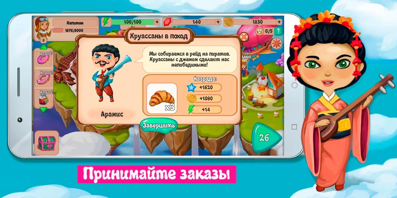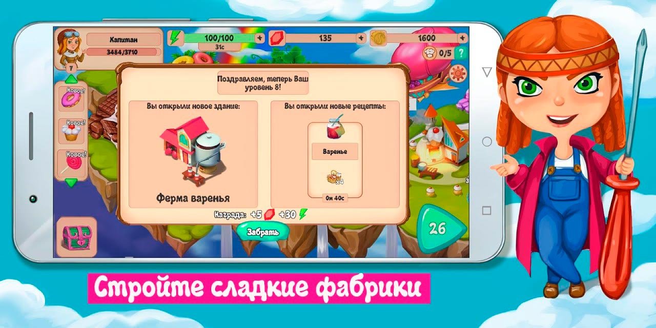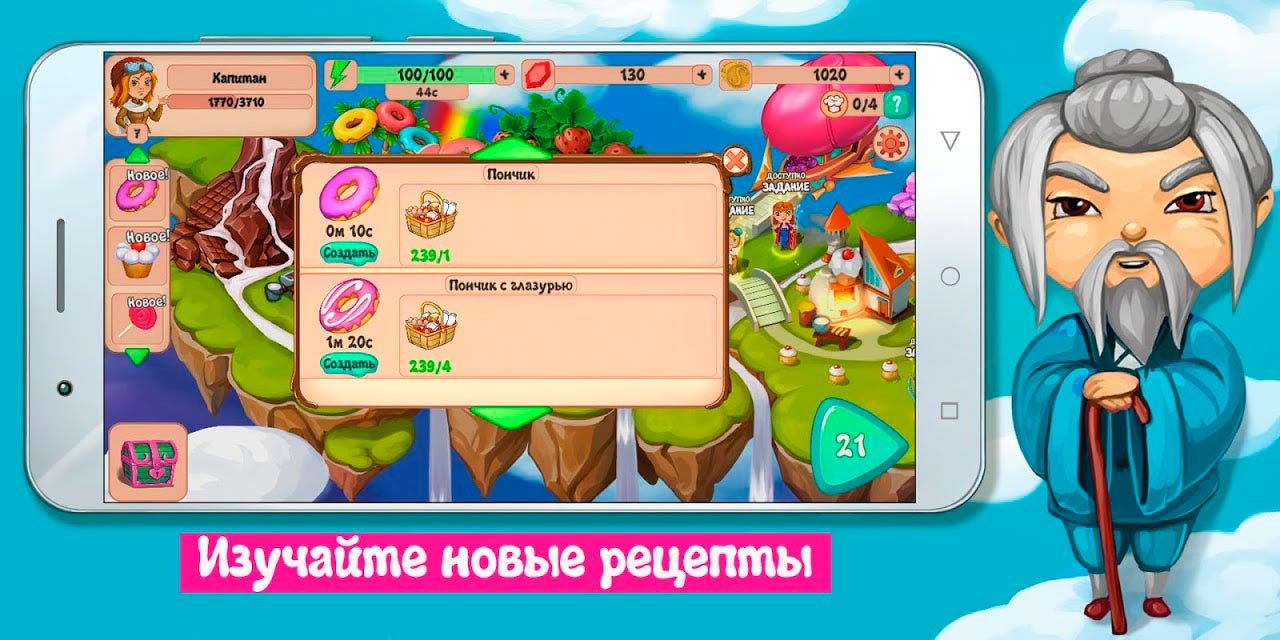 Игрокам нужно будет встать на сторону самых успешных кондитеров и получить под свое управление огромную кондитерскую компанию. Ее необходимо будет раскручивать и постоянно улучшать. Мастер Тортикус оставил все, что имел специально для вас, поэтому приготовьтесь разобраться со всем. Займитесь приготовлением своего первого в жизни десерта и подайте его к столу ваших клиентов. В процессе участия в Небесный повар. Волшебная фабрика сладостей можно будет строить целую империю из сладостей, чтобы добиться превосходных результатов. Расставляйте на карте как можно больше новых фабрик и собирайте ресурсу, нужные для приготовления новых продуктов. Вам придется превознести себя как можно выше, среди остальных мастеров кондитерских. Каждый день игроков будут ждать новые и новые уровни, в процессе прохождения которых можно собирать три в ряд линии и очищать игровое поле. Развивайте инфраструктуру и продолжайте развиваться, пока не сможете пройти все задания и выйти вперед. Небесный повар. Волшебная фабрика сладостей самый настоящий симулятор веселья.Небесный повар. Волшебная фабрика сладостей сюжет и сбор три в ряд