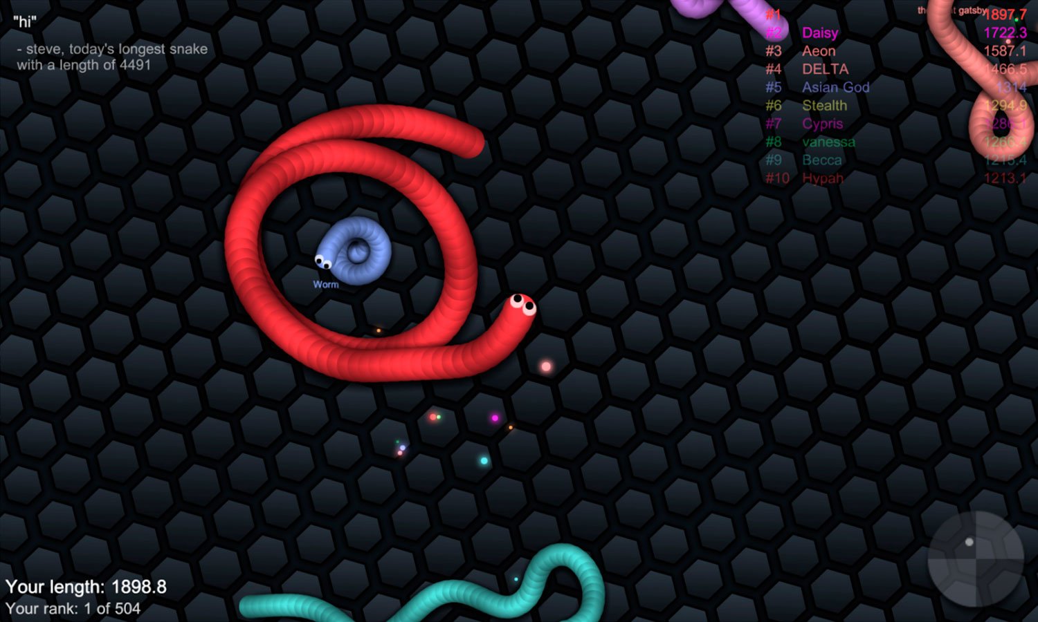 Именно в этой игре у вас будет прекрасный шанс отличиться от других игроков и создать огромную змею. Достигайте таких размеров, о которых другие игроки до этого совершенно ничего не знали. Старайтесь не попадать под более мощных зверей иначе взорветесь, и смело приближайтесь к крохам. Вы будете даже устраивать погоню за ними с целью пополнить свой запас. Побеждайте их и тем самым увеличивайте свою длину. У каждого червя будет свой уникальный цвет, который нельзя будет перепутать. Его можно подбирать с помощью настроек и характеристик зверька.