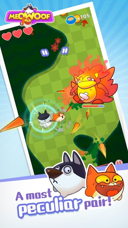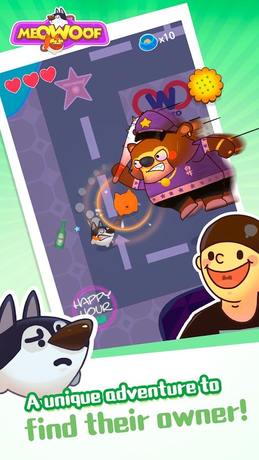 Всего лишь одна кнопка для управления этой игрой и это естественно очень удобно. Поэтому с ней справятся игроки любого возраста. Собирайте пару вместе и управляйте ей одновременно, получая совершенно новый опыт от мобильных игрушек. Это действительно веселые и интересные приключения, окунувшись в которые вы вряд ли сможете быстро оторваться. Meowoof использует многоуровневую систему, и чем дальше вы пройдете, тем сложнее будет разбираться с препятствиями. В конце каждого из этапов забавных питомцев будет ждать столкновение с ужасными боссами, которых придется побеждать. Посещайте огромное количество разных локаций и следуйте за подсказками.