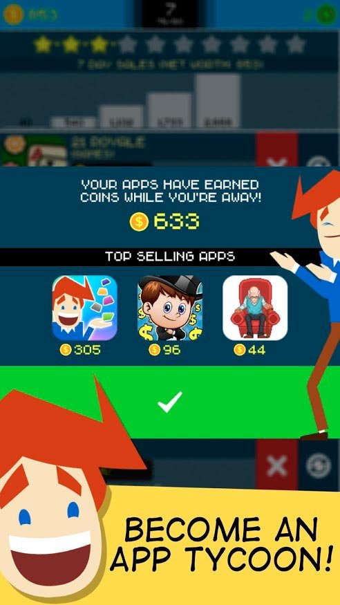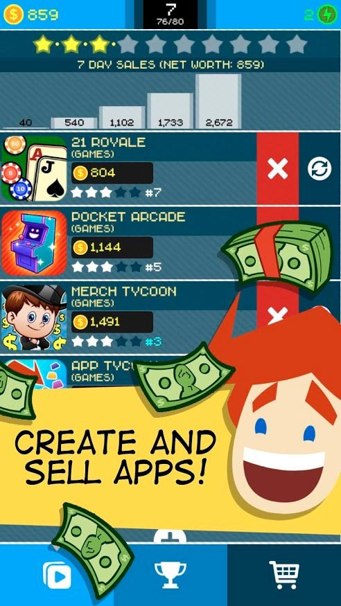 Узнайте абсолютно все о том, что происходит в мире этого огромного бизнеса. Занимайся созданием удивительных приложений и пробивайся дальше. В процессе продвижения по App Tycoon тебе предстоит, как падать очень низко, так и подниматься в гору, завоевывая огромное количество денег. Создавай новые приложения, отправляй их в массовость и наслаждайся результатами. Это самая уникальная мобильная игра, в которой тебе предстоит сыграть в качестве опытного бизнесмена. Разрабатывайте разные мобильные игры и программы, что позволит тебе разбогатеть. Попробуйте продвинуть свое первое новшество, и продай его как можно дороже. Ваша игра в симуляторе начнется с жизни молодого парня, который только что начал входить в ритм этой жизни. Начинай работать в старом и неудобном гараже, после чего заработаешь первые деньги, и сможет продвигаться дальше. Любой участник App Tycoon может очень быстро стать магнатом и это поможет тебе вызвать на конкуренцию самых лучших в истории разработчиков.App Tycoon способ создать первое приложение