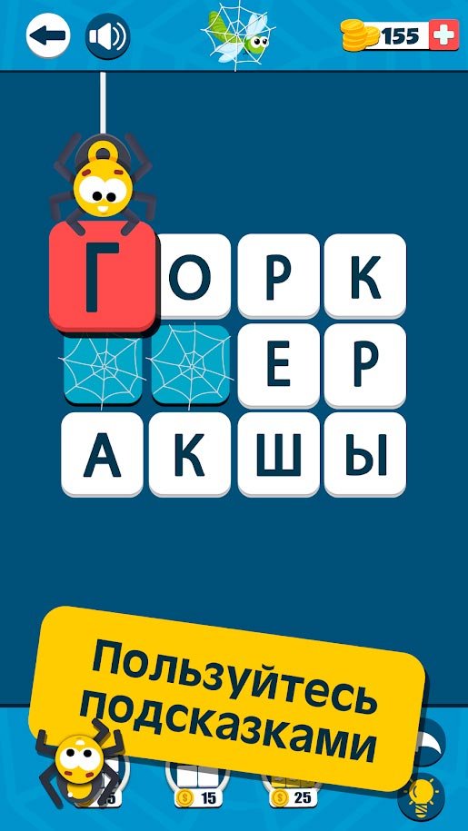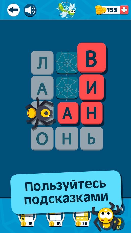 Как только ваши друзья попали в ловушку, вам сразу же нужно будет пойти в эту головоломку и помочь им. Сделать это возможно только в том случае, если вы будете решать словесные головоломки. Очень злой и коварный паук запутал все в Паутина: Найди Слова и теперь буквы не могут выбраться из нее. Игроку предстоит проводить линии, чтобы решать головоломки и это будет очень сложно и даже запутанно. Постарайтесь применить все навыки и способности лишь для того, чтобы решить новые головоломки и продвинуться еще дальше. Игроку предстоит искать новые возможности, собирать слова с помощью паутины воедино и таким образом помогать выбраться вашим друзьям из ловушек. Огромное количество самых разнообразных головоломок будет вам доступно прямо сейчас. Вы можете решать их все, чтобы наслаждаться атмосферой и ставить новые рекорды в словесной головоломке. Больше семи сотен самых разных и интересных словесных головоломок будет доступно вам. Паутина: Найди Слова отличная возможность добиться лучших результатов.Самая затягивающая головоломка Паутина: Найди Слова