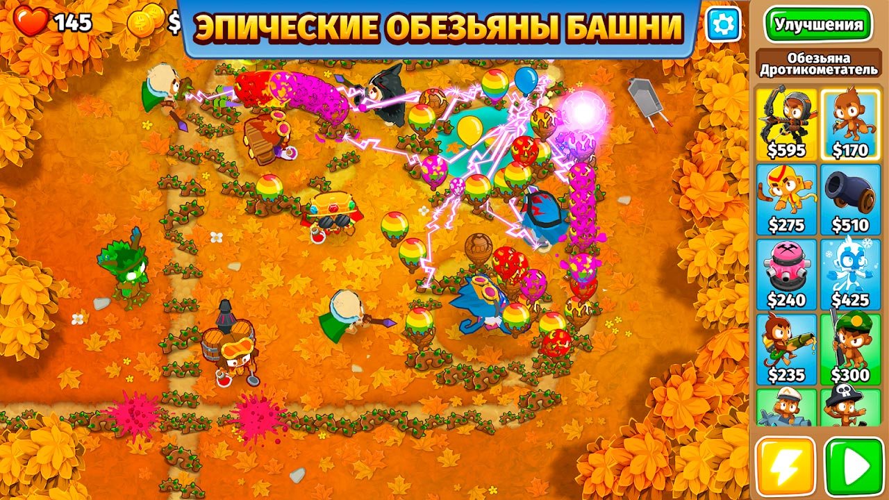 Теперь этот игровой процесс о шарах улучшился заметно, но только в лучшую сторону, поэтому игроки будут в восторге от того, что им предлагает этот игровой процесс. Красивая и насыщенная красками трехмерная графика, как будто зовет окунуться в это бесконечное веселье и игроки уже не могут потом оторваться от нее. Весь сюжет Bloons TD 6 заключается в том, чтобы воспроизводить оборону собственной крепости, но для этого обязательно нужна особенная стратегия и тактический план. Используйте его, чтобы перехитрить врагов и добиться максимального преимущества. Идеальная защита крепости просто необходимо, потому что врагов буде очень много. Поэтому по периметру расставляйте множество разного оборудования, производите улучшения своих задействованных героев и уничтожайте шары, которые будут летать здесь. Как только в Bloons TD 6 вы завидите приближающуюся волну врагов, тут же выполняйте выстрел и набирайте бонусные баллы, для своей копилки очков.