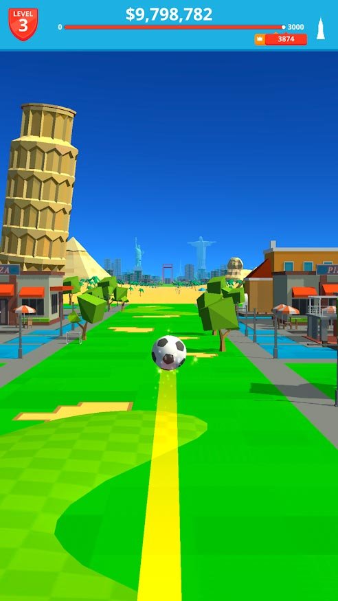 Приготовьтесь бить по мячу как можно сильнее, чтобы отправить его в ворота точным метким ударом. Вас ждут самые разнообразные места этого огромного мира, и там нужно будет пинать мяч и зарабатывать очки или баллы. Попытайтесь пропнуть мяч через такие места как Статуя Свободы или даже Эйфелева башня, а может быть, игрока занесет к египетским пирамидам. В Soccer Kick сможете путешествовать по миру и побывайте в самых нереальных местах.