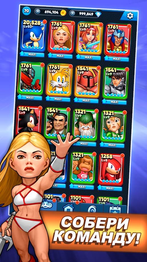 Путешествуйте и собирайте самых легендарных героев из Сеги. Сражайтесь во вселенной и путешествуйте по этому масштабному миру. У вас под управлением может оказаться самая эпичная и мощная команда из супергероев. Улучшайте их способности постоянно простыми кликами. Научитесь выполнять коронные фишки, о которых все знают из ностальгических воспоминаний. Участвуя в сражениях, вам нужно будет обучиться специальным приемам и ударам. Комбинируйте и наслаждайтесь великолепным процессом. В этом экшене вам предстоит сразиться против Дремаген, компании, пытающейся захватить весь мир СЕГИ. Соник, доктор Эггман, Мистер Х и еще куча разных персонажей будут доступны в SEGA Heroes.Особенности игры