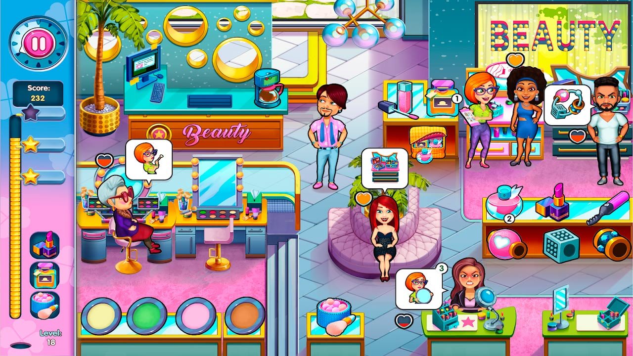 Очень увлекательная и захватывающая сюжетная история, в которой будет огромное количество любви, страсти и даже опасностей. Займитесь своим собственным салоном красоты прямо сейчас и ежедневно обслуживайте новых клиенток. Они могут приходить с самыми разнообразными просьбами, которые вам предстоит выполнять. Естественно кроме сложностей в этой уникальной игре будет полно веселья и наслаждения. Пройдите эти приключения, сделанные в жанре оригинального тайм-менеджмента и постарайтесь добиться лучших показателей. В Sally's Salon: Kiss & Make-Up каждая история отдельного клиента выглядит уникальной и интересной. Наводите порядок с красотой посетителей через участие в более чем двадцати игр.