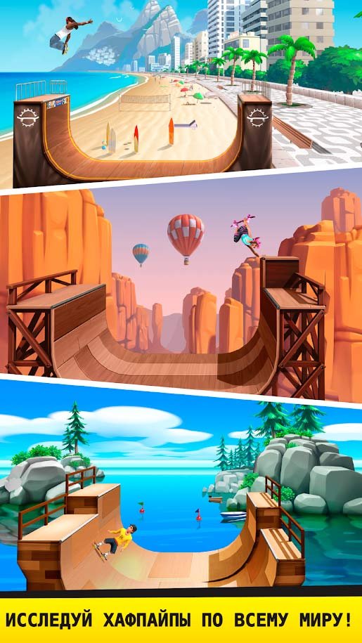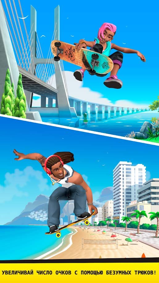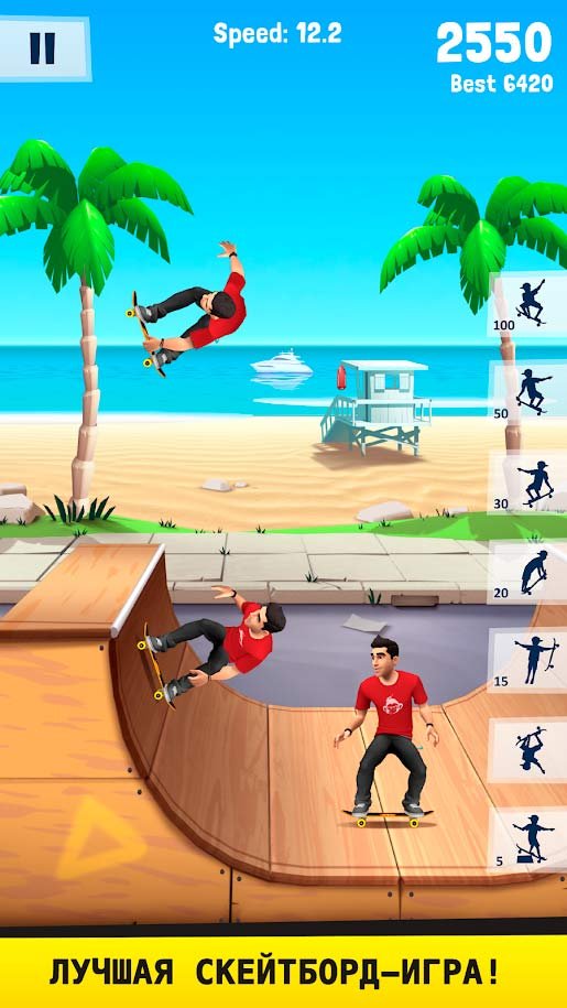 Можно выбрать абсолютно любую доску, чтобы начать приключения и продемонстрировать свои профессиональные навыки. Приготовьтесь к поездке, от которой будет действительно захватывать дух. Скользите по массе разных хафпайпов и рампам, чтобы набрать огромное количество очков. Получайте удовлетворение от того, что у вас получится выполнить крутую комбинацию. Любой может вместе с Flip Skater стать самым крутым скейтером во всем мире. Набирайте максимальную скорость и подлетайте на скейте как можно выше. Путешествуйте по новым городам и ставьте там новые рекорды. Вас будут ждать в абсолютно каждом месте на этой огромной планете. Изучайте новые специальные приемы и используйте их в деле, чтобы стать самым лучшим.