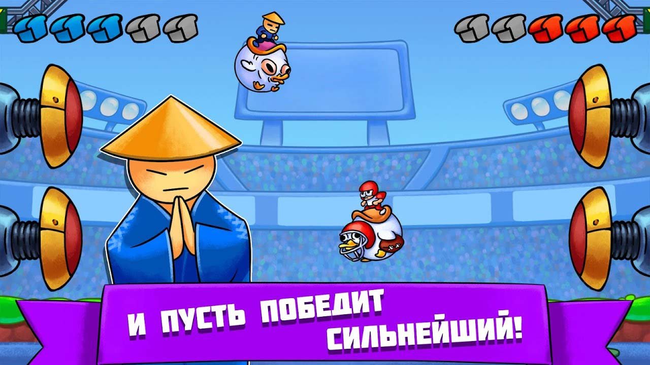 Пришло время поднять себе настроение и повеселиться от души, а для этого идеально подойдет эта игрушка. Здесь пользователи участвуют в поединках на надувных утках, и выглядит это забавно. Попытайтесь победить как можно больше оппонентов, чтобы стать чемпионом и постоянно прокачивайте свое животное. Чем больше обновлений удастся поставить игроку, тем серьезней будет сила утки. Например, можно собрать даже киборга или единорога, что точно даст отпор. Присутствует больше десятка красочных и оригинальных стадионов, в которых придуманы специальные сложности. Все это доставляет удовольствие и кураж игрокам из Duckball: Jump Ahead. Покажите всем, что являетесь самым лучшим и побеждайте, зарабатывая новые награды. Кроме улучшений очень важно использовать хитрость и обмануть соперника, своими интеллектуальными способностями.Особенности игры
