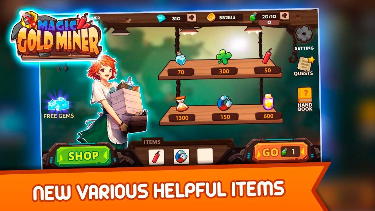 В качестве целей игрока будут входить обыкновенные поиски золота, которого можно добывать бесконечно. Копайте как можно глубже к недрам земли и добывайте множество новых ресурсов. Например, шахтер в Gold Miner 2019 может найти под земляным покровом драгоценные алмазы, остатки древних животных, камни и еще много всего разного. У вас будет доступ к огромному количество предметов и инструментов, которые можно использовать для продолжения. Если вы готовы к таким испытаниям, тогда не думая подключайтесь к ним. Будет очень легко играть в этом приключении и искать новые богатства. Уже доступно больше шести десятков оригинальных и интересных уровней. Замечательная графика и анимация будет по достоинству оценена многими пользователями, а этот интересный внешний вид героя подарит вам приятные эмоции.Особенности игры