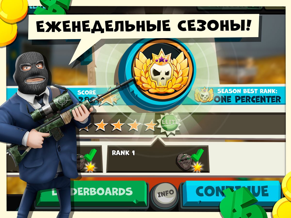 Когда игрок сможет скачать Snipers vs Thieves: FPS-битва на андроид у него появиться возможность принимать участие в этом многопользовательском процессе сразу в двух ролях. Первая роль снайпера, в которой игрок должен будет встать на защиту своего тайника от других игроков, потому что все хотят легкой наживы, а значит, желающих заработать на вашем хранилище будут сотни. Убивайте всех и не позволяйте им доставить ваши деньги до машины, потому что тогда они совершат побег. Организуйте во второй роли свою команду из опытных воров и вместе отправляйтесь на завоевания тайников. Для этого можно будет пригласить своих друзей и вместе включиться в гонку за лидерство среди грабителей и преступников.Грабьте вместе с другими игроками
