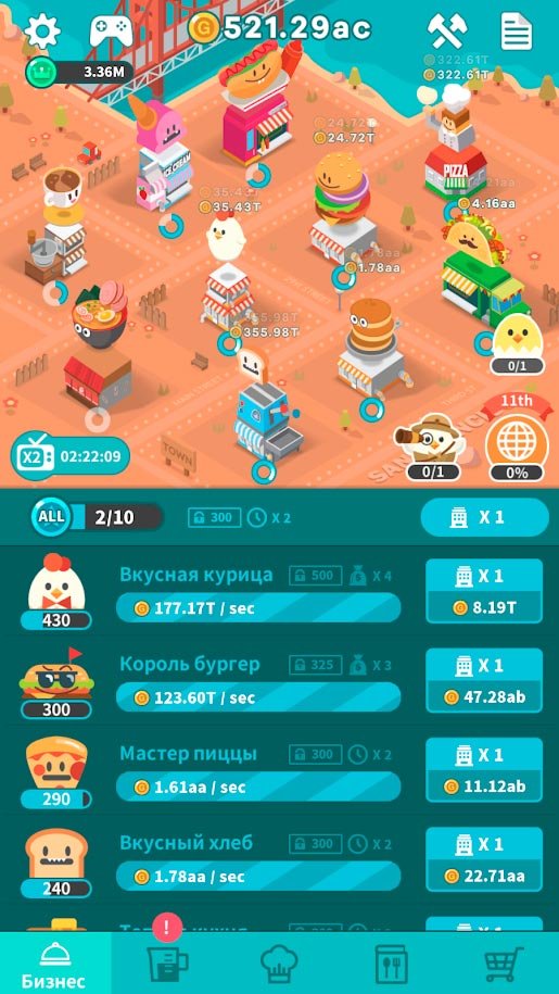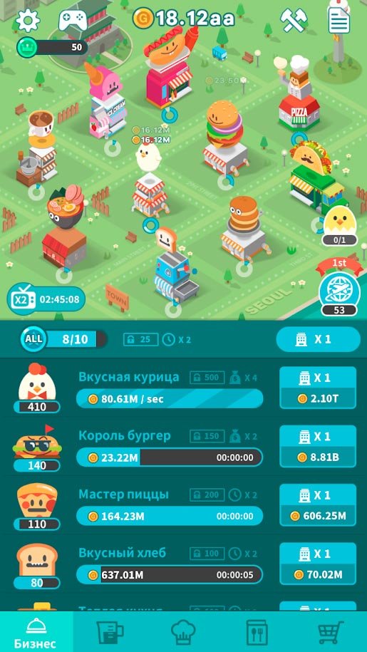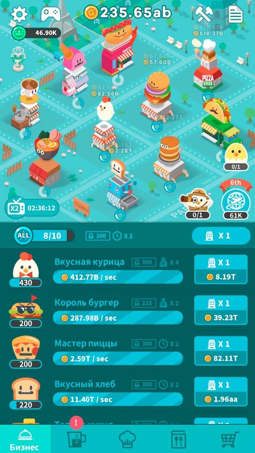 Начните зарабатывать свои деньги прямо сейчас и улучшайте систему. Это будет особенный бизнес, участвовать в котором невероятно весело. Управляйте ресторанами по всему городу и извлекайте огромное количество прибыли. Инвестируйте только в правильное дело и получайте заслуженно заработанные монетки. Постоянно увеличивайте свой уровень мастерства и оптимизируйте работу системы. В этом красивом городе под названием Фуудпиа можно открыть множество новых заведений, но на все потребуется невероятное количество времени. В Foodpia Tycoon можно получить отличную репутацию и превзойти других пользователей. Пусть в ваших кафе и ресторанах трудятся только самые лучшие повара и работники, способные только улучшить питание. Здесь за всем нужно следить как в реальности.