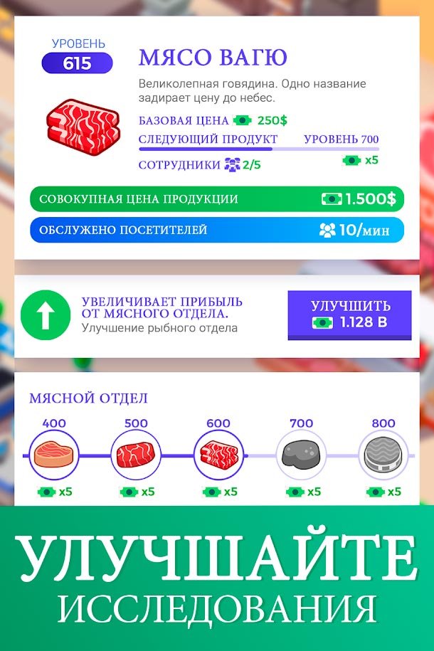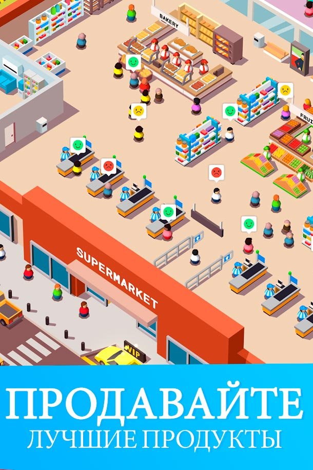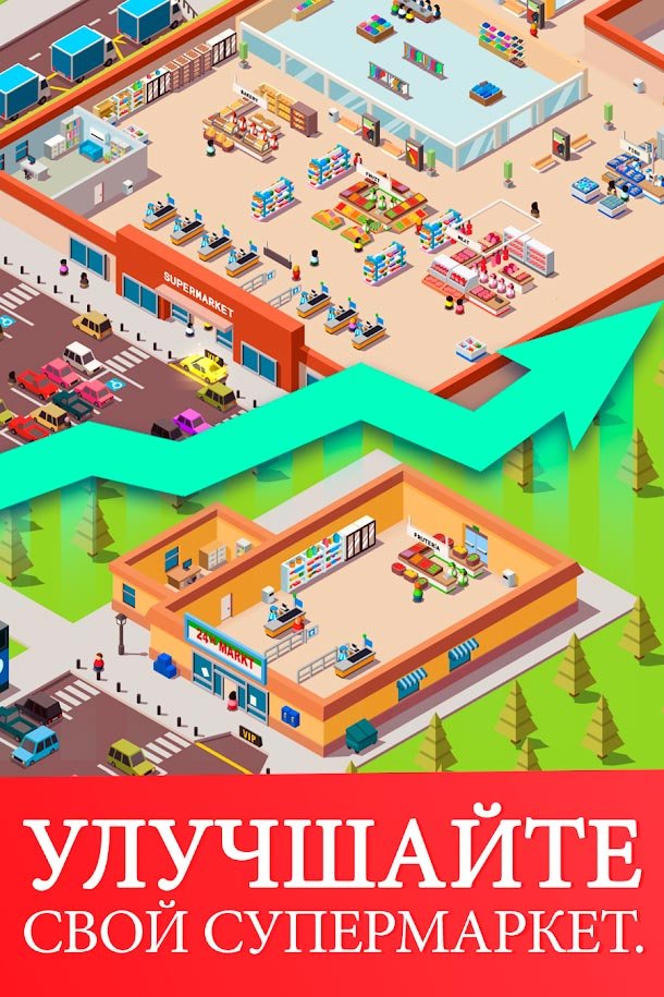 Самая главная цель данного симулятора состоит в том, чтобы стать самым богатым в мире владельцем супермаркетов. Постепенно налаживайте собственный бизнес и улучшайте его систему. Вам предстоит создать лучшее место в мире и тогда оно точно обретет невероятную популярность среди миллионов жителей этого города. Обязательно займитесь запуском пекарни, продавайте фрукты или свежие овощи, а также не забывайте про мясо самых разных сортов и видов. После этого уже можно будет добраться до открытия ларьков с продажей электроники или бытовой техники. Главное чтобы в Idle Supermarket Tycoon – Shop посетители постоянно уходили с полными корзинами и довольными лицами. Изучите огромное количество самых разнообразных функций и расширяйте собственное дело до невероятных размеров.