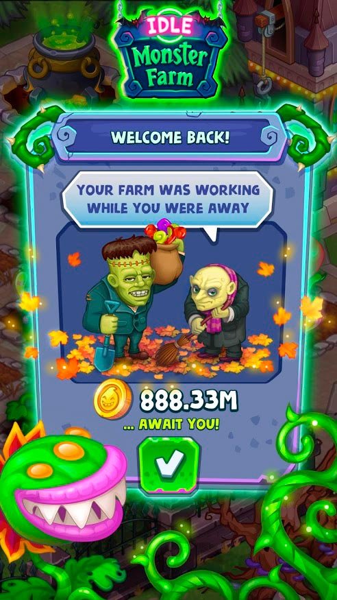 Очень много самых ужасных и фантастических посевов будет доступно в этом увлекательном симуляторе. Займитесь выращиванием тыквы, подготовленной специально для Хэллоуина, займитесь рассадой грибов или даже подбирайте яблоки из золота. Если вы будете постоянно следить за своим хозяйством, тогда получится собрать урожай и использовать его для изготовления шикарных произведений кулинарного искусства. Все это вскоре придут и покушают монстры. Продавайте все больше продуктов, товаров и блюд, получая прибыль, а таким образом ваш новый фантастический бизнес будет развиваться. В этой стратегии помогать пользователю будут такие персонажи как зомби, пауки, вампиры или даже призраки. Подготовьте уникальное торжество.Особенности игры Idle Monster Farm: Ферма в Городке Монстров