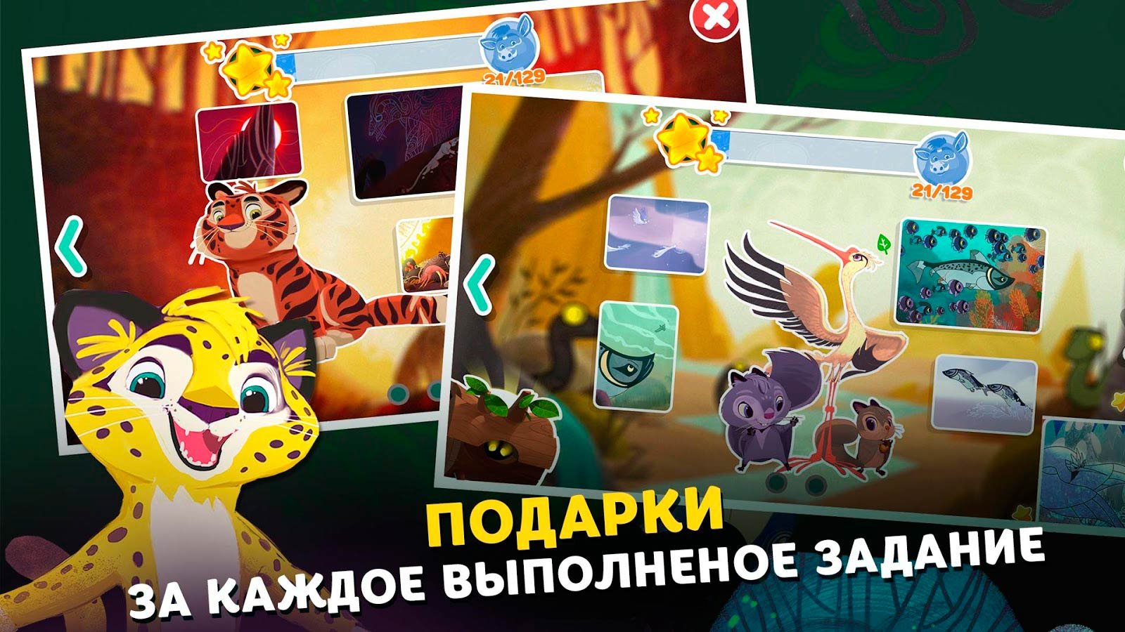 С приложением Лео и Тиг скучать не придется. Включайте свою смекалку и проверьте скорость реакции, также не забывайте про навыки памяти и логики. Все эти умения вы быстро сможете развить вместе с этой игрой, что однозначно пригодится любому человеку и в реальной жизни. Проходя веселые уровни, вы будете открывать яркие картинки, вспоминая самые интересные моменты мультфильма. Из таких моментов выйдет отличная коллекция, которой вы всегда сможете насладиться и показать ее друзьям. Отправляйтесь вместе со знакомыми героями навстречу приключениям уже сейчас.