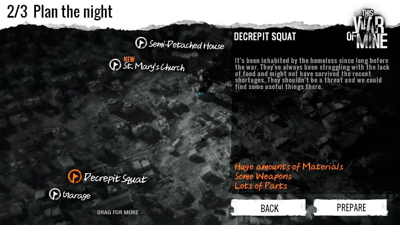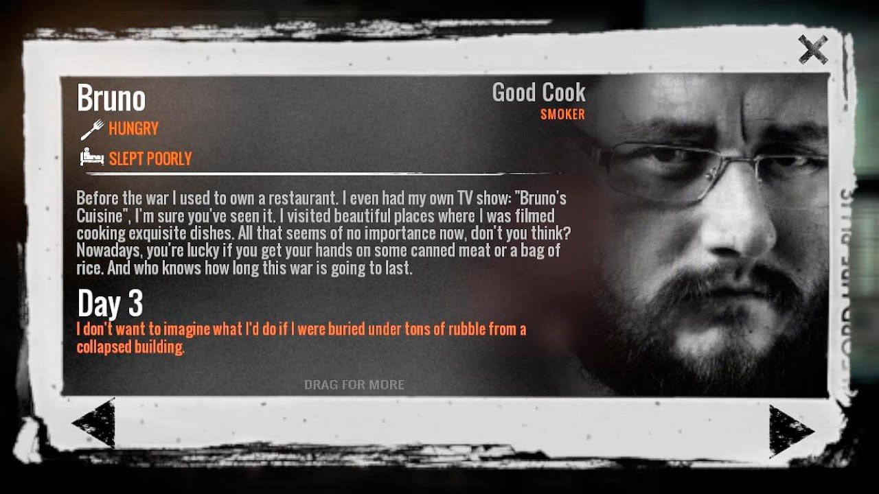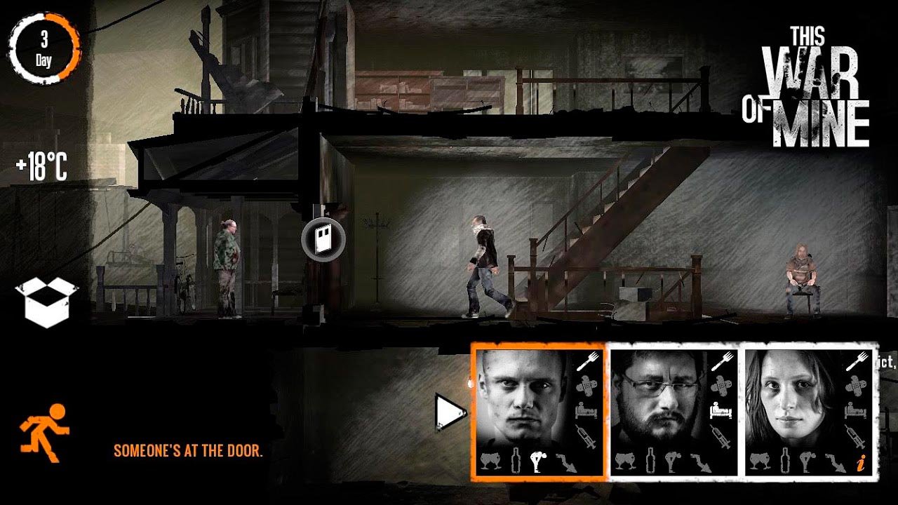 Задействуйте все свои персональные навыки в этом испытании и найдите еду, которая поможет дольше протянуть местным жителям. Кроме того, в такое тяжелое время они будут очень сильно подвержены заболеваниям, от которых нужно спасаться. Для этого оккупированные должны будут пользоваться лекарствами, и остерегаться снайперов. Снайперы будут следить за каждым постоянно и не дадут поводов выбраться наружу. Ночью у вас будет шанс выбираться на свободу, чтобы исследовать новые локации и найти как можно больше ресурсов. Только это поможет вам остаться в живых и дойти до финала. Постоянно думайте в This War of Mine о следующих шагах и выбирайте правильные решения. Задача выжить находится не только на физическом плане, но и на моральном.
