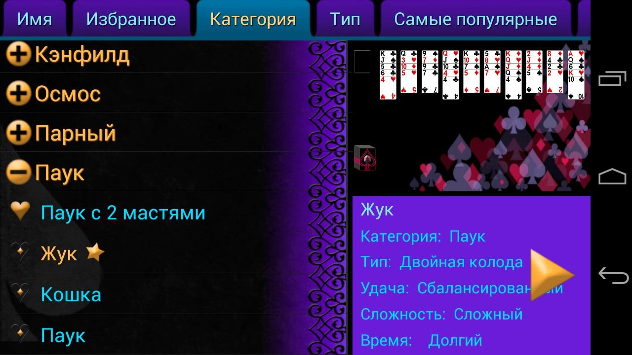 Собирайте огромное количество увлекательных и веселых пасьянсов в самом лучшем сборнике для вашего смартфона. Специально для поклонников солитера подобрано невероятное количество затягивающих карточных соревнований. Все они представлены в замечательной анимации и стильном оформлении. Почувствуйте атмосферу и грамотно распоряжайтесь своим свободным временем, потому что вместе с Бесплатная коллекция пасьянсов оно пролетит незаметно. Поклонники солитера заслужили право испытать свои навыки в данном сборнике, потому что это будет удивительно. Создавайте сотни комбинаций и улучшайте свои персональные навыки. Увеличивайте рекорды и обходите своих друзей в таблице глобального рейтинга. Соберите больше всех очков, и главный приз будет вашим.