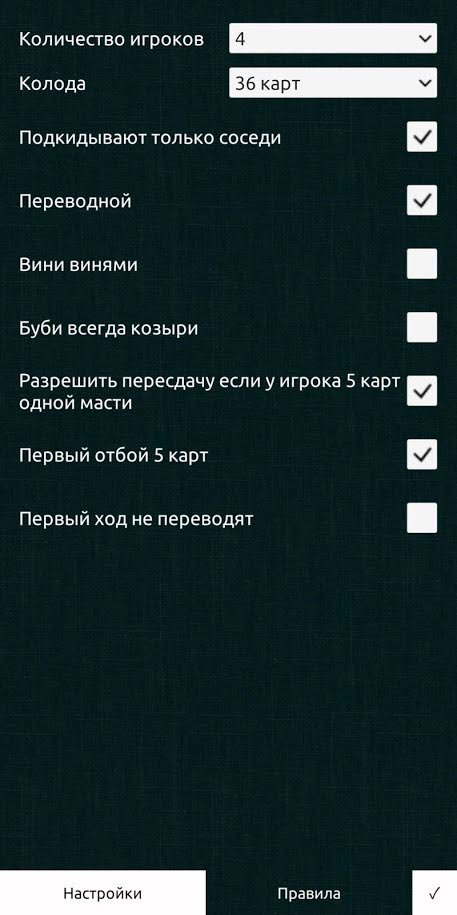 Прямо сейчас подключайтесь к игре в интересного дурака и увеличивайте собственный опыт и мастерство ежедневно улучшая навыки и показатели. Вы можете самостоятельно настраивать правила игры и использовать свою уникализированную стратегию. Играйте в переводного дурака или подкидного, нет ограничений в вашем любимом занятии. Кроме того, здесь каждый пользователь может самостоятельно производить настройку параметров. Например, вы можете поиграть такими видами карт как японские или пики-пики. Ежедневно пользователь в Дурак с настройкой правил будет увеличивать свой счет и уровень состояния. Есть две универсальные колоды, и вы можете выбрать любую. Здесь полно параметров, которые помогут вам улучшить свои результаты.