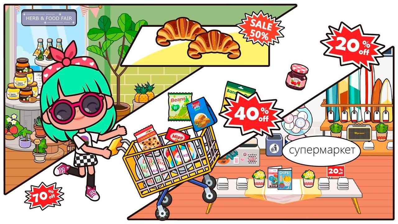 Игровое пространство, в котором можно будет проявить свою фантазию и творческие способности. Выбирайте маленьких героев и переодевайте их в любые варианты нарядов, делайте красивыми и великолепно выглядящими. Можно покрасить волосы в абсолютно любой цвет, сделать шикарную завивку и придумать уникальную прическу. В этом городе пользователи будут заниматься любыми делами и могут исследовать еще не открытые местности. Проводите эксперименты и комбинируйте несколько вариантов, чтобы в результате получать то, чего не делали другие игроки. В Miga Город :магазин придумано 6 сценариев, по которым может пройти игровой процесс и каждая адаптирована для определенной локации. Супермаркет, спорт товары, собственная квартира, парикмахерская, салон красоты, все это уже открыто для ваших фантазий.