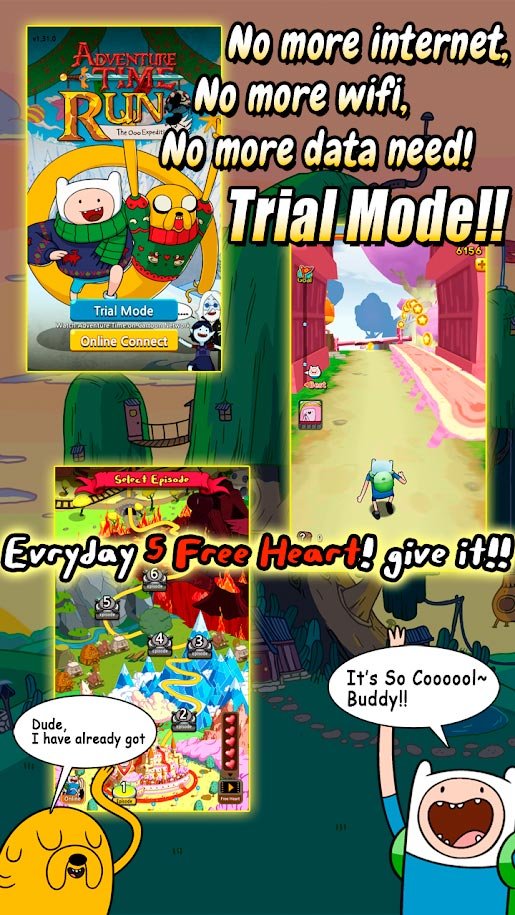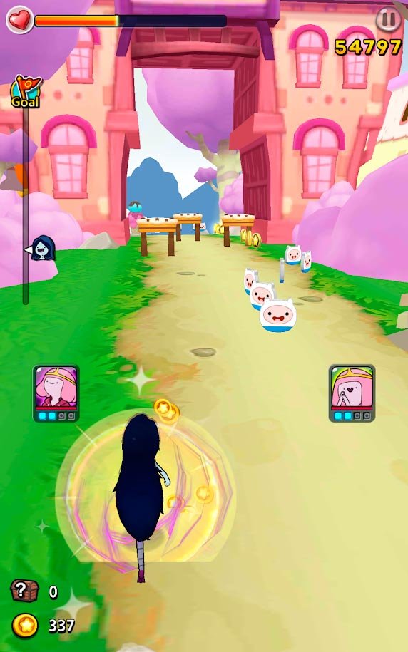 Встречайте самых веселых персонажей в мире, таких как Финн, Джейк, Марселин и других. Все они уже сегодня могут появиться на экране твоего мобильного устройства и начнут участвовать в приключениях. Пробегите через масштабное королевство конфет, побывайте в Снежном царстве и естественно не обойдется без уровней в Горах. Это далеко не все локации, доступные пользователям для продолжения приключений, тут есть и другие. Автоматическая система постоянно следит за рейтингом и подсчитывает его, поэтому здесь присутствует очень напряженная конкуренция. Собирайте по мирам сокровища и пополняйте ими собственный запас. В процессе прохождения Погоня "Время приключений" нужно открывать порталы и набирать скорость.