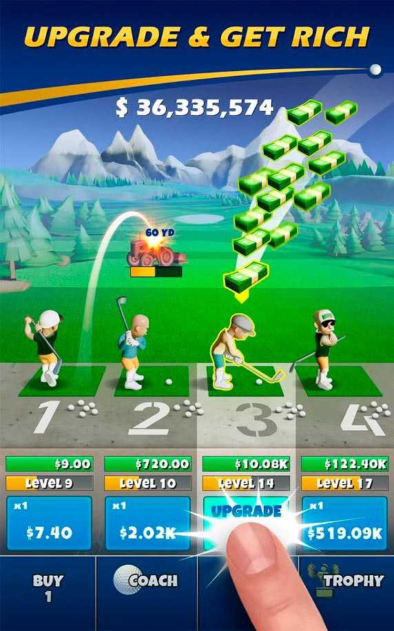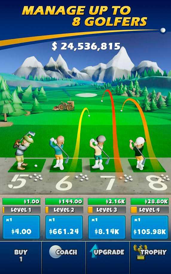 Начинайте наслаждаться игрой в увлекательный гольф и постепенно отстраивайте свой собственный громадный полигон. Управляйте дорогой для автомобилей и на этом зарабатывайте дополнительные средства. Игроки смогут проводить огромную работу с тренерами и даже получат возможность полностью автоматизировать процесс получения прибыли. Побеждайте и добавляйте к своему запасу все больше золота. Пусть ваш клуб гольфа приносит невероятную прибыль. Управлять в Idle Golf можно сразу же 8-ю игроками и заменять некоторых, которые уже заканчивают. Выигрывайте трофеи в свою коллекцию, и это поможет в улучшении престижа клуба. Для управления процессом не нужно никаких дополнительных навыков и все осуществляется в пару касаний. Вы будете выполнять массу действий для продолжения участия в гольфе.Особенности игры Idle Golf