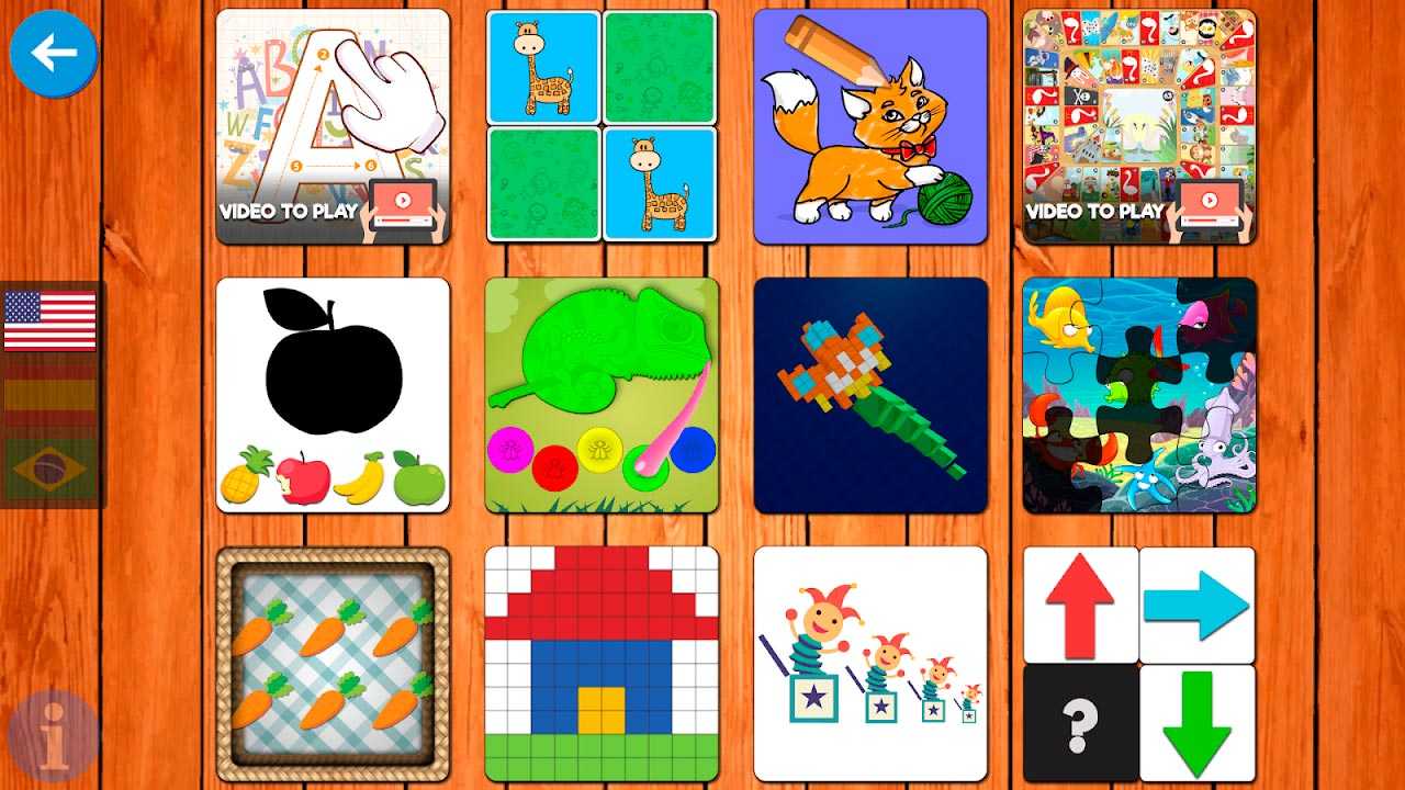 Совершенно новый сборник мини-игр уже доступен бесплатно и окажется полезным для пользователей. Здесь находится большая подборка игрушек, которых более десятка и каждая по своему интересная и может многому научить. Выбирайте русский, португальский, испанский или английский язык, чтобы продолжить. В процессе дети смогут в легкой игровой форме изучить весь алфавит, обучаться правописанию, проявят смекалку и получат удовольствие от рисования. Вместе с Детские развивающие игры 5 очень много веселья, от чего будет невероятно сложно оторваться. Отличайте различные фигуры по размерам и стилям, рисуйте красочные изображения, получайте удовлетворение от участия в играх настольного жанра и просто улучшайте свои навыки и мастерство.
