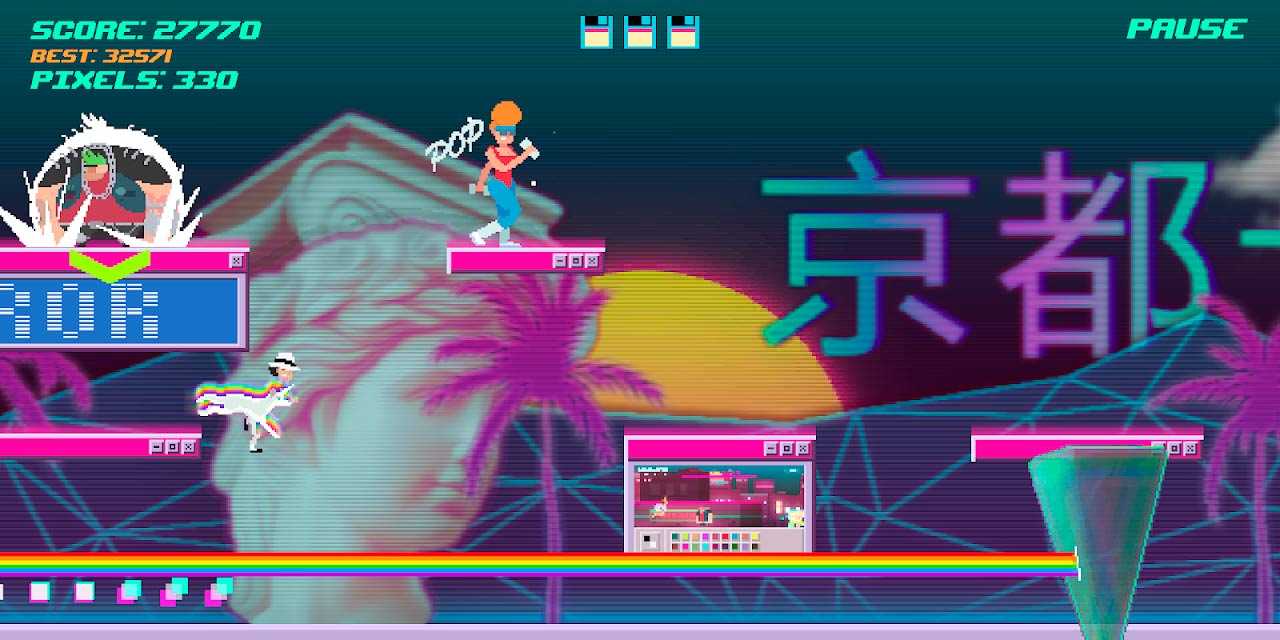 В Top Run: Retro Pixel Adventure можно выбирать уровень сложности, от обычного режима, в котором будет достаточно легко, до безумного, предназначенного для хардкорных игроков. А еще здесь вы сможете обставить собственную комнату в стиле 80-х, покупая разные предметы за собранные бонусы.Особенности: