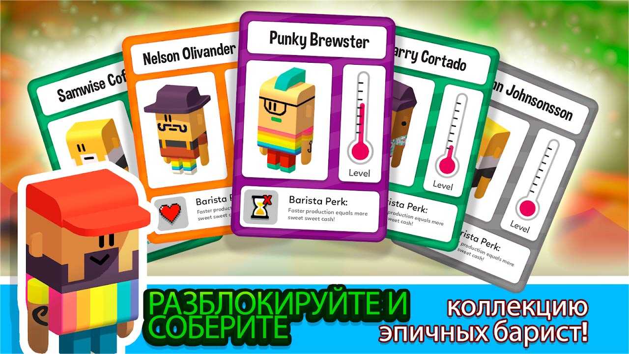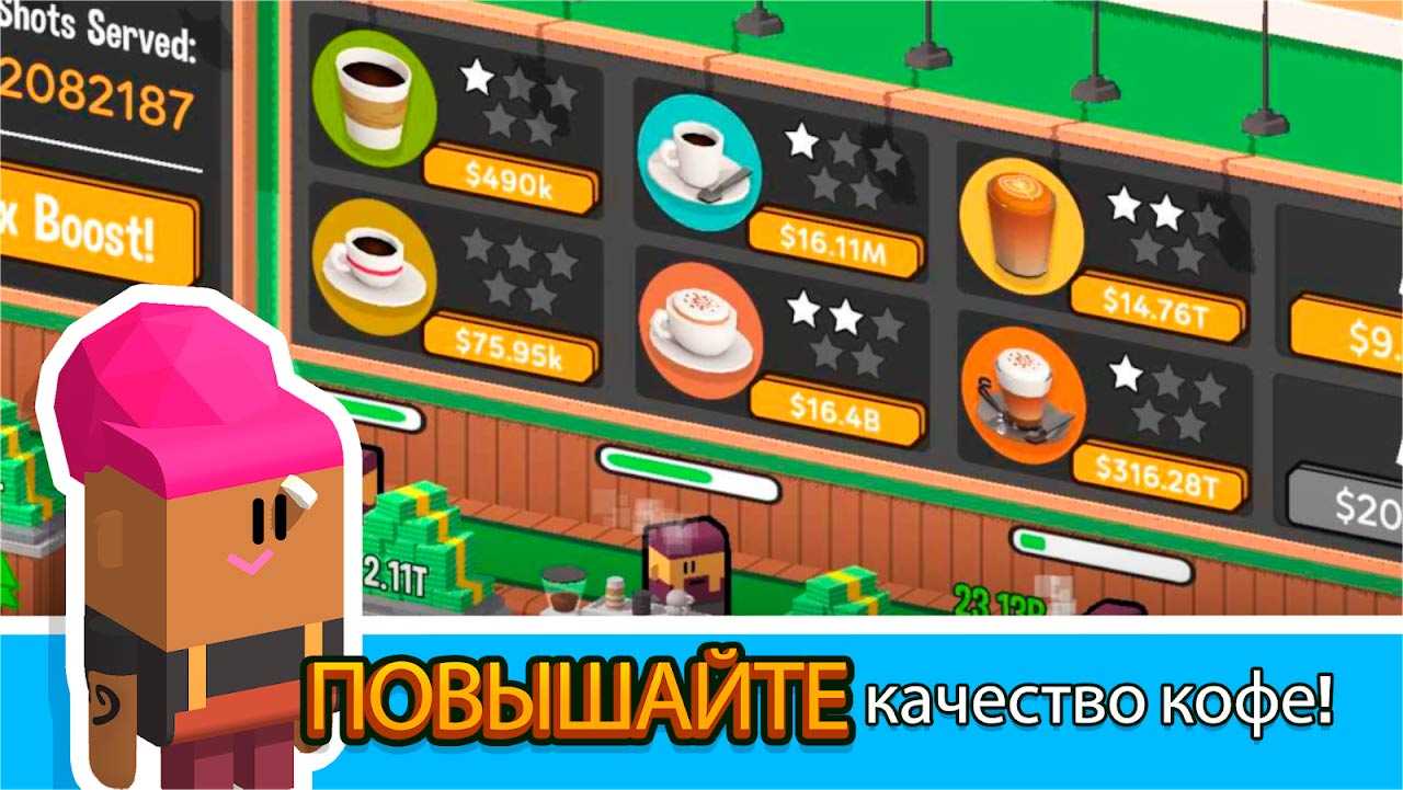 В первую очередь этот симулятор кликер привлекает пользователей таким милым геймплеем и прикольными персонажами. Они выглядят очень весело и вносят свою изюминку в атмосферу. Игрокам нужно будет заняться франшизой и повышать качество разливаемого по стаканам клиентов кофе. За счет этого повысится спрос, и можно будет зарабатывать уже миллионы денег. Разблокируйте сотрудников с уникальными характеристиками и способностями, они обязательно добавят престижа вашему кафе.