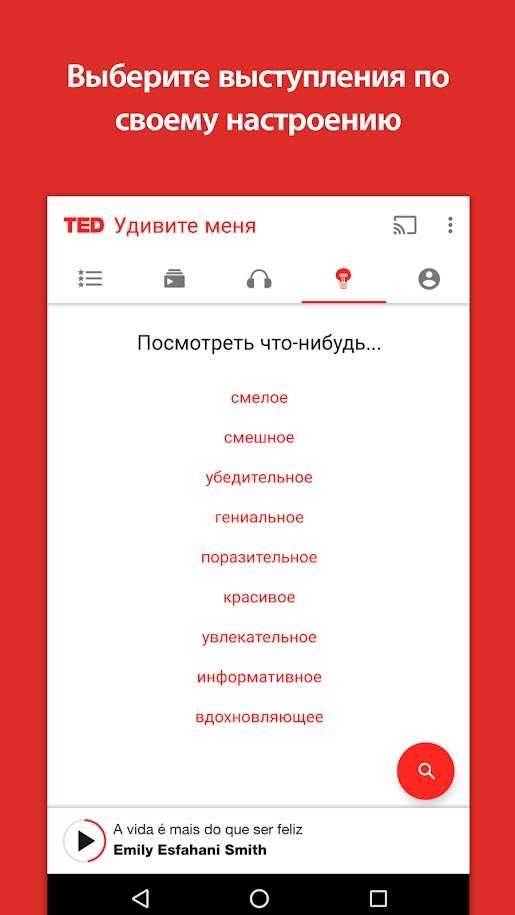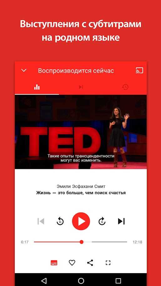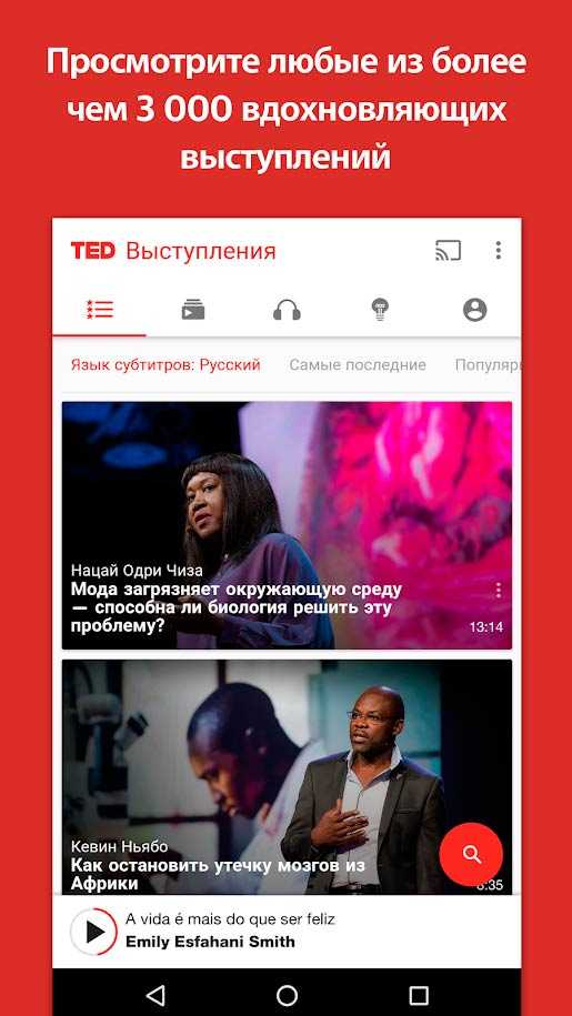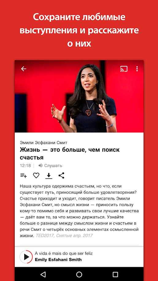 В TED можно создавать собственные плейлисты и синхронизировать их между разными устройствами, также программ предлагает вам индивидуальные подборки с учетом ваших потребностей. Создавайте закладки, скачивайте материалы, чтобы посмотреть или послушать в оффлайн-режиме и получайте новые знания.