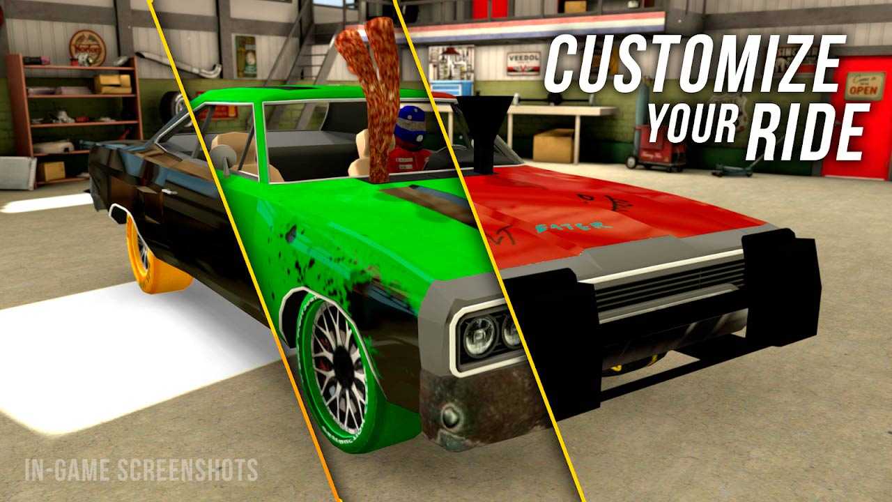 Demolition Derby Multiplayer – это продвинутая система повреждений, апгрейды и гибкая кастомизация автомобилей. Зарабатывайте очки опыта в битвах с соперниками по всему миру или создайте приватный матч, в котором можно помериться силами с друзьями.