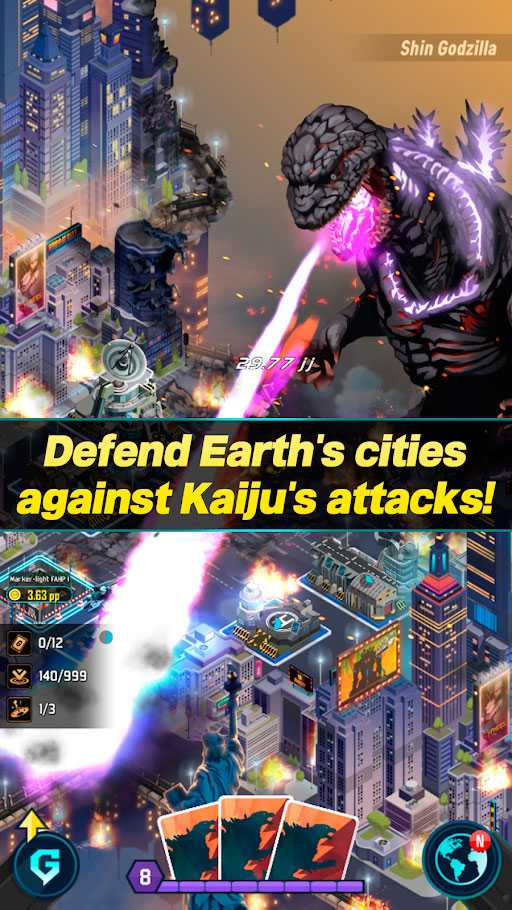 В Godzilla Defense Force вы встретите гигантов из 29 фильмов, начиная с первой картины 1954 и до наших дней. Соберите полную коллекцию монстров и узнайте массу полезной информации о них из встроенного кодекса.