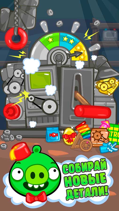 Игроку, который решит скачать Bad Piggies на андроид, предстоит пройти больше 170-ти уникальных игровых уровней, а также принять участие в глобальных обновлениях. Постарайтесь собрать на каждом задании все три звездочки и почувствовать это веселье. Открывайте новые головоломки и проходите их с большим удовольствием. Вам предстоит поломать голову, чтобы собрать летательный аппарат и заработать большое количество звездочек. Постройте с помощью имеющихся предметов это уникальное средство перелетов и отправляйте свиней в опасный путь.