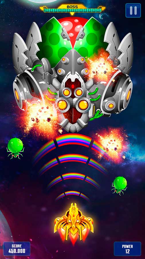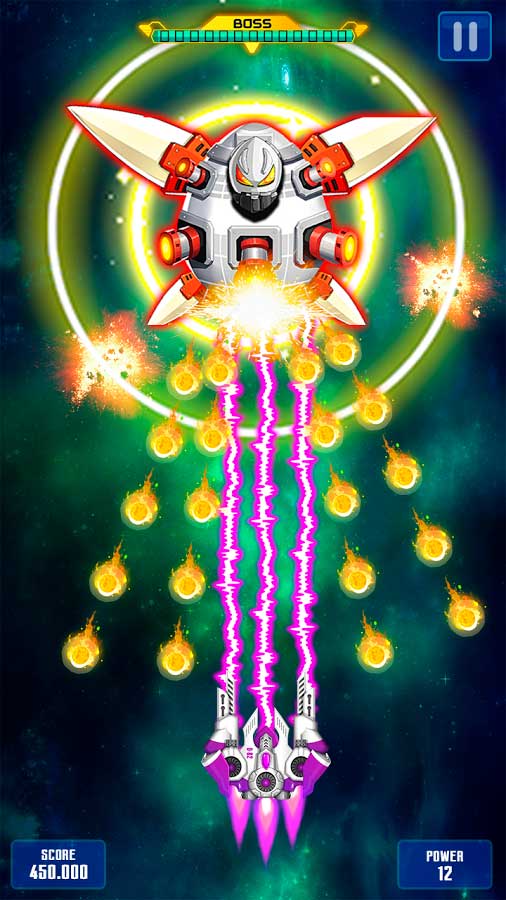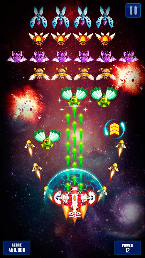 Получайте на свое мобильное устройство замечательную возможность весело провести время и убить огромное количество часов. Участвуйте в фантастических битвах и старайтесь сдержать бешеные волны из вражеских кораблей. Организуйте непробиваемую защиту галактики и отбивайте уже захваченные земли. Игроку предстоит пройти больше сотни уникальных уровней и сделать свой корабль супермощным. Чтобы было проще разбираться с фантастическими уровнями вы можете пользоваться бонусами и тогда легко справитесь с боссами. Убивайте бесконечные толпы нарушителей, чтобы добиться восхождения на пьедестал лидера.