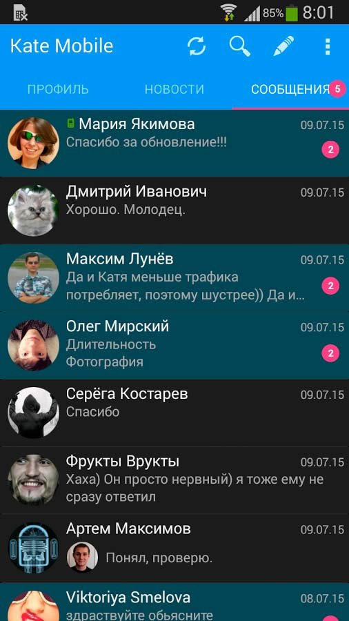 Никто не сможет узнать, что вы находились в сети, а в ваших сообщениях можно выбрать замечательную функцию, которая позволяет закрывать его, не прочитав. Это нужно на случай того, чтобы собеседник не смог понять, каким образом вы могли прочитать его сообщения, не заходя Вконтакте. Нельзя не сказать об оформлении, когда из новостных лент можно запросто переходить в сообщения, не теряя того места, где вы ранее остановились. Чтобы в этом убедиться, нужно скачать Kate Mobile на адроид. Подобная система поиска не может не понравится пользователям. Пользуясь быстрыми оповещениями, вы сможете принимать все сообщения вовремя, даже если приложение было свернуто в тот момент
