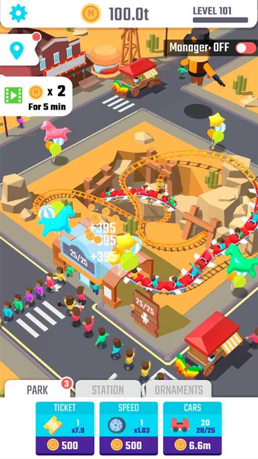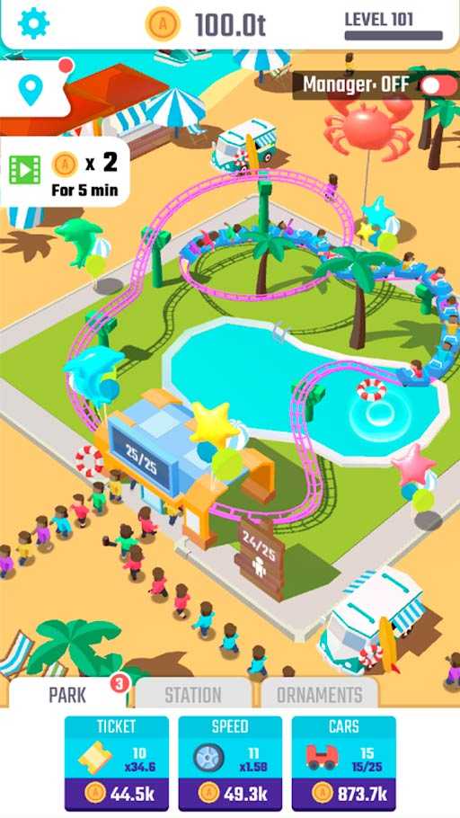 Определи стратегию развития и двигайся по заданному курсу, привлекая все новых туристов в свой парк. Чем радостнее народ в парке, тем больше прибыли это место приносит и тем быстрее вы откроете новые возможности для игры. Готовы ли вы стать менеджером лучшего развлекательного заведения в городе и поднять его на новый уровень?
