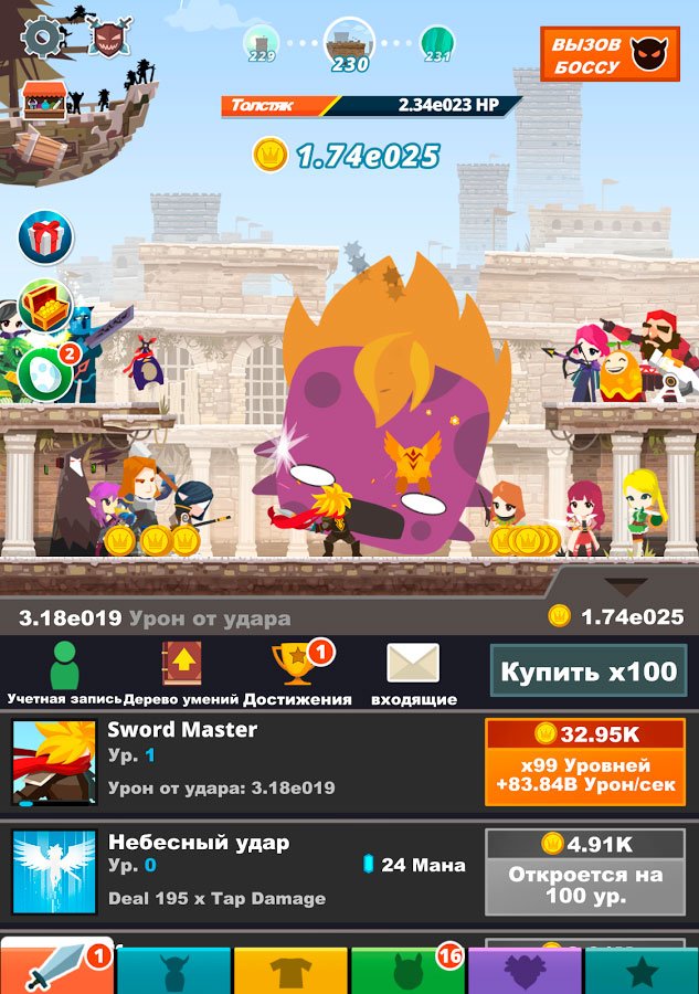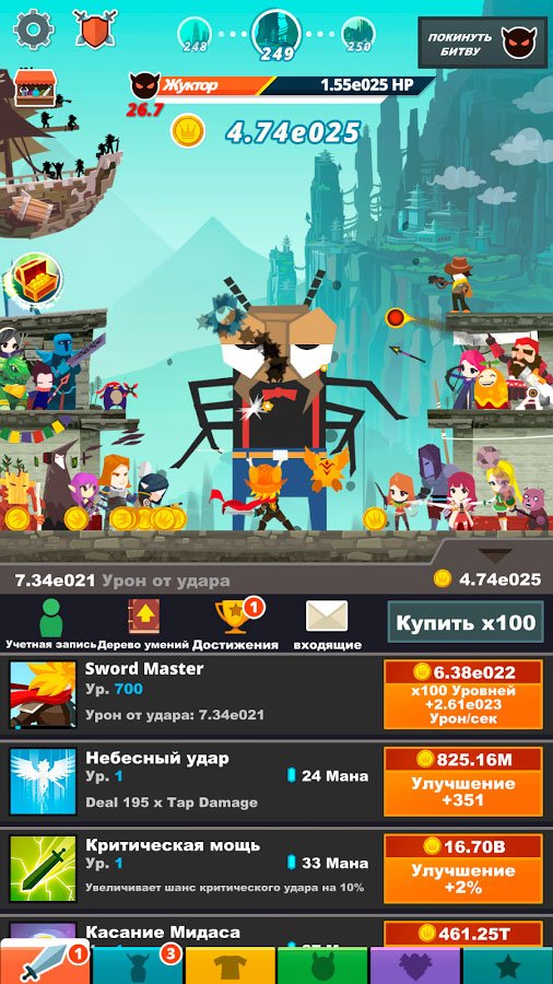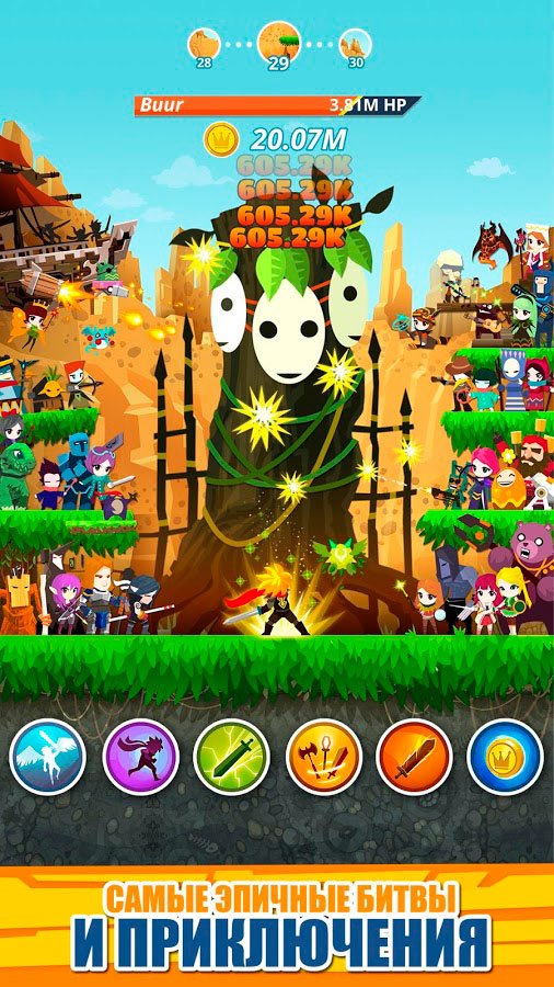Игрок, который решит скачать Tap Titans 2 на андроид сможет вновь прочувствовать атмосферу фантастических поединков и окружающего мира. Теперь в игре появились новые Титаны, их количество достигло 120 видов. Каждый по-своему уникален, а выглядят все они устрашающе. Попытайтесь уничтожить их, посетив 10 разнообразных миров. Каждый мир выглядит очень красочно и ярко. Возьми в свою команду лучших героев, которые будут бороться с монстрами до последней капли крови. Более того в бою могут помочь и смелые питомцы. Они с легкостью справятся с мощными атаками противника.