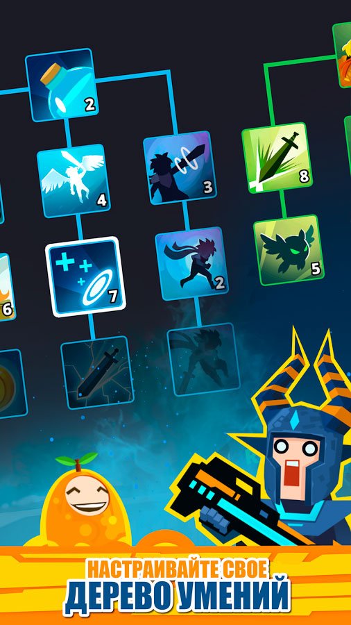 Открывайте новое оружие и разработайте свой личный боевой стиль. Открывайте новые навыки и способности. За победу в каждом уровне будут выданы награды в виде золота. На него можно будет приобрести эксклюзивные артефакты. Собери в свой арсенал самое крутое снаряжение, чтобы настроить внешний вид своего героя. Чтобы не было скучно можно вступить в какой-нибудь клан. В другом случае создать его можно самостоятельно и пригласить туда друзей образовав мощный человеческий союз. Устройте соревнование между игроками со всего мира.