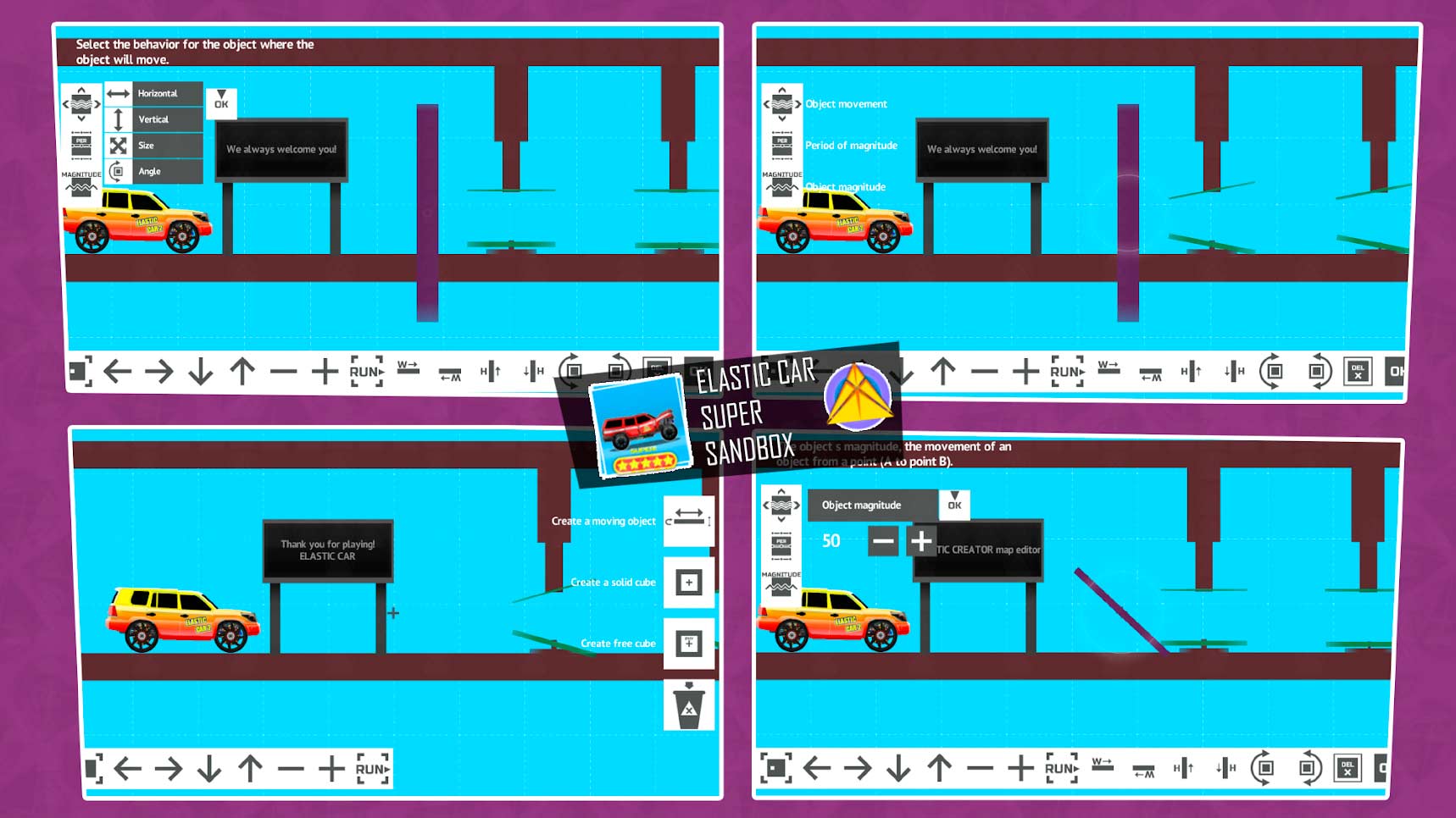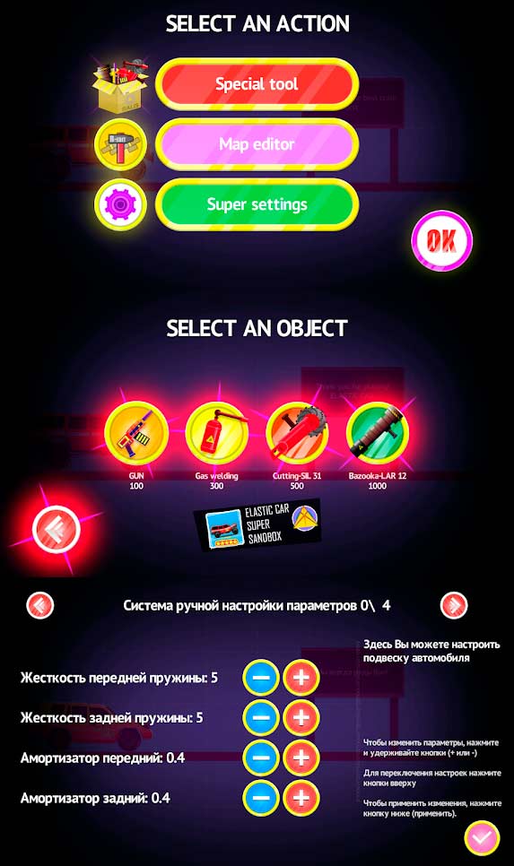 ELASTIC CAR SUPER SANDBOX – это увлекательный двухмерный симулятор краш-тестов. Если вы любите экспериментировать, изменяя законы вселенной, то эта игра именно для вас. Помимо большого выбора готовых карт, здесь также можно собственноручно создавать карты, на которых будут проходить испытания машин. Выбирайте, какое транспортное средство вы хотите проверить на прочность сегодня и начинайте эксперимент. Здесь вы многое узнаете о различных деталях и их стойкости.