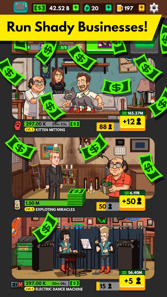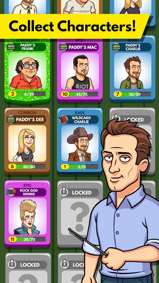 Always Sunny: The Gang Goes Mobile – это забавное приложение, созданное по мотивам одного из популярнейших сериалов современности. Вместе с Маком, Дэннисом, Чарли, Фрэнком и Ди начинайте творить свойственную им хрень и наслаждайтесь процессом. Помогайте героям облапошивать дураков, придумывать новые сумасшедшие схемы и подставлять друг друга. Шайка снова в сборе, так что пришло время оторваться от души.