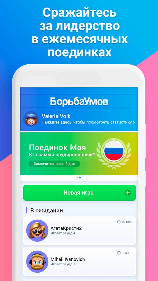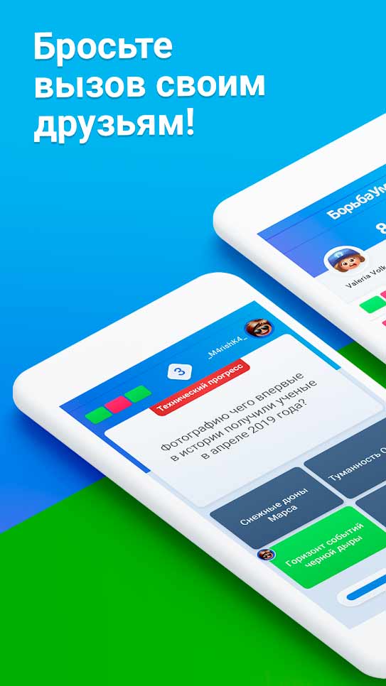 Борьба Умов – это занимательные битвы интеллектов, в которых может участвовать любой желающий. Пара десятков категорий вопросов ждет всех любознательных людей. Тут вы отлично проведете время, освежите свою память и узнаете много интересных фактов, о которых ранее могли и не догадываться. Миллионы людей по всему миру каждый день принимают участие в проходящих в этом приложении соревнованиях, и их количество стабильно продолжает расти.- захватывающие интеллектуальные сражения;