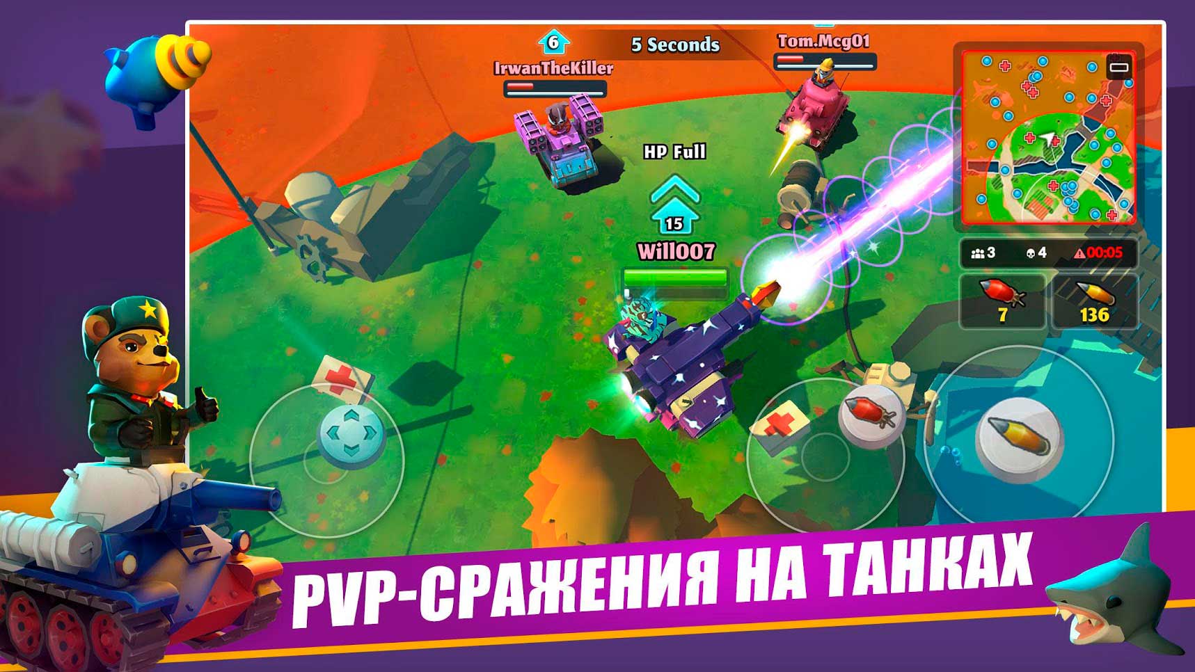 PvPets: Tank Battle Royale – это забавные танковые сражения с приятной графикой и милыми персонажами. Выбирайте себе героя, сажайте его в танк и отправляйтесь покорять удивительный мир многопользовательских баталий. Здесь вы будете весело воевать с игроками со всего мира, получать награды и продвигаться по рейтинговым таблицам. Открывайте новые модели танков, модернизируйте их высокотехнологичными деталями и устанавливайте мощное оружие.- эпичные многопользовательские сражения;