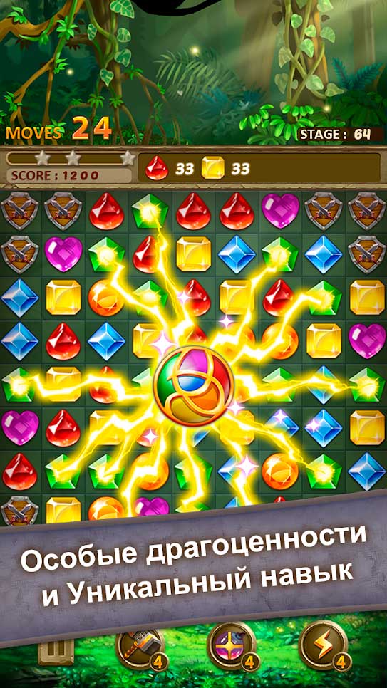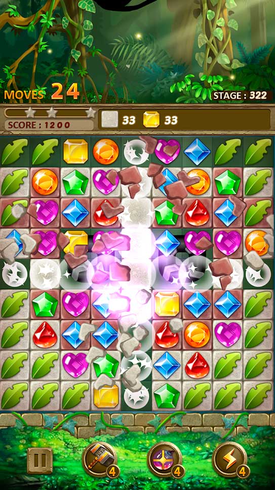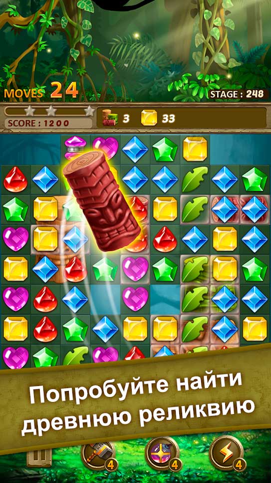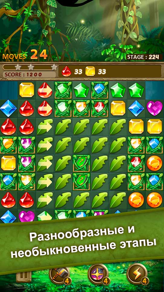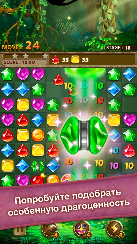 Jewels Jungle – это увлекательная игра-головоломка, в которой вы будете исследовать густые и загадочные джунгли в поисках драгоценных камней. Уровни представлены в простой механике «три в ряд», с которой может быстро разобраться даже ребенок, так что процесс обучения не продлится долго. Отыскивайте одинаковые драгоценности и получайте за это очки, чем больше таких камней вы найдете – тем более весомую награду и получите.