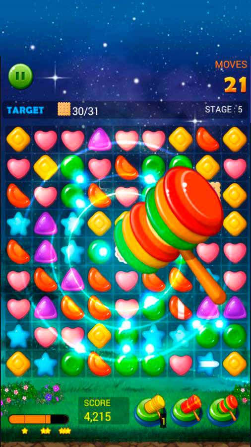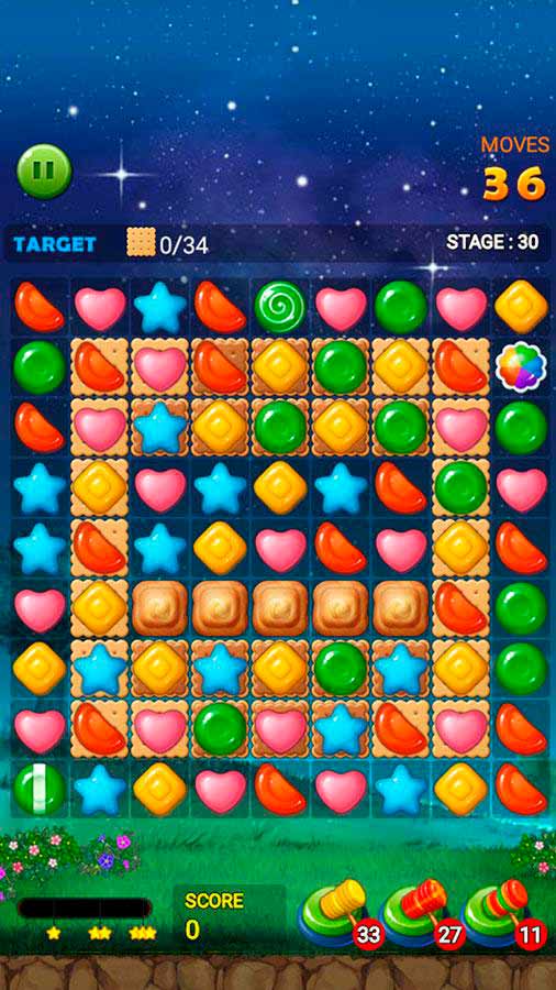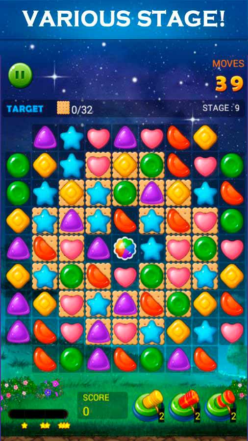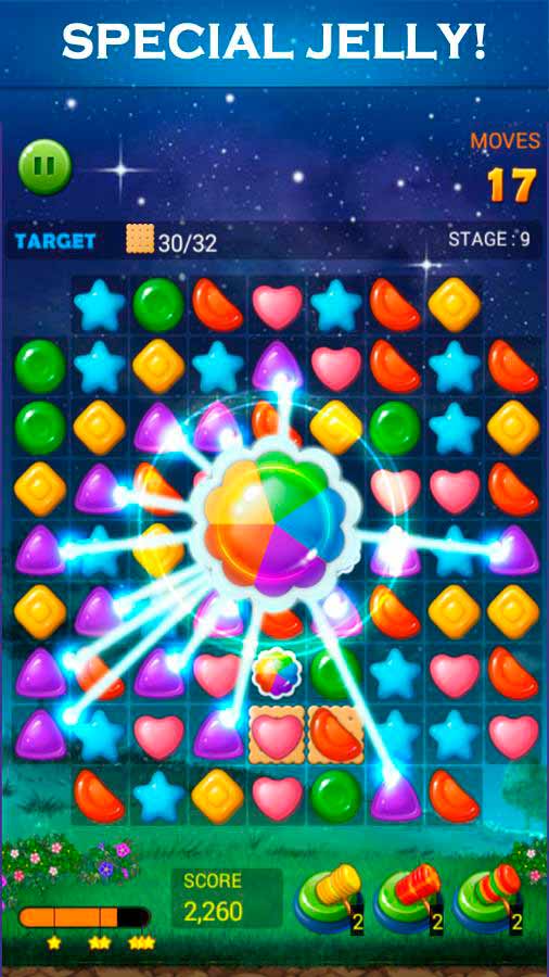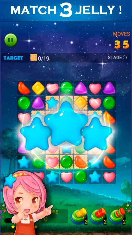 Jelly Star Night – это веселая игра-головоломка с незатейливой механикой и яркой графикой. Здесь нужно просто соединять 3 или больше желе одного цвета и получать за это очки. Переходите от уровня к уровню, собирайте новые желейные вкусности и наслаждайтесь расслабляющим игровым процессом. Тут нет ограничений по времени и не нужно наличие постоянного соединения с интернетом – играйте когда и где угодно.