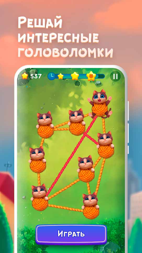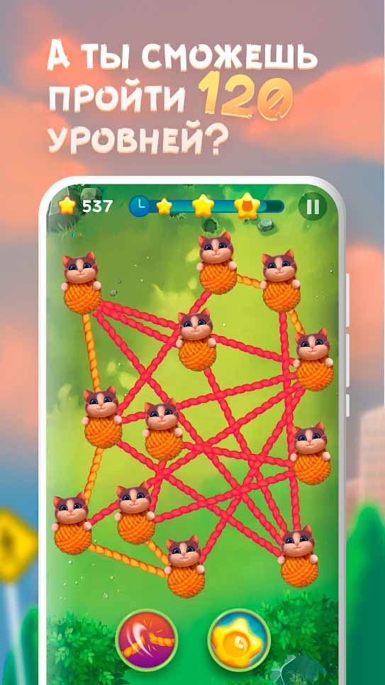 Tangled cats – это забавная головоломка для мобильных устройств, в которой вам придется распутывать запутавшихся в клубках котиков. В игре сотни уровней, для их прохождения необходимо убирать пересечения красных ниток. Такие логические задачки понравятся всем любителям проявить свои умственные способности. Разгадайте все загадки, и перед вами откроется удивительная история Кэттауна.- захватывающая сюжетная линия;