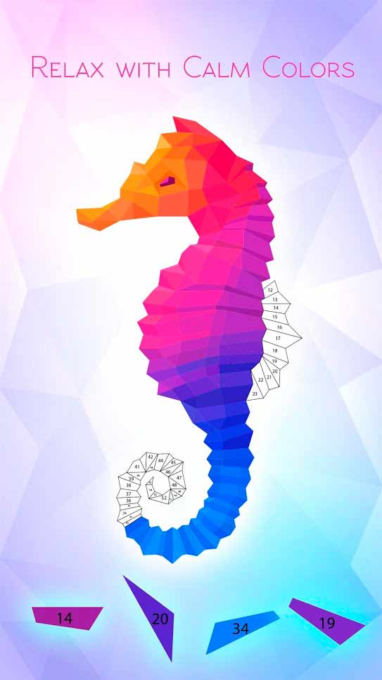 Calm Colors – это отличный способ отдохнуть и провести время с интересом. Раскрашивайте картинки по номерам и наслаждайтесь спокойным монотонным игровым процессом. Тут можно отвлечься от обыденности и с головой погрузиться в фантастический мир с шикарными визуальными эффектами, в котором хочется быть как можно дольше. Большое количество изображений из различных категорий понравится всем любителям работать с цветом и приятно проводить свое свободное время.- успокаивающая атмосфера;