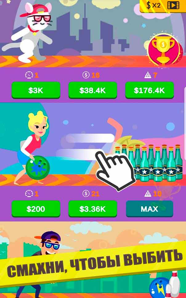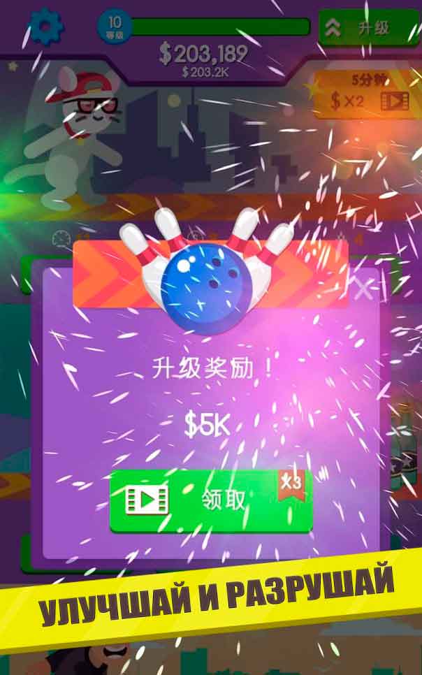 Bowling Idle – это классная новая игра про боулинг для мобильных платформ. Тут вы сможете не только покатать шары и посбивать кегли, но и возглавите огромный парк развлечений. Занимайтесь раскруткой своего дела, приобретайте лучшее оборудование, привлекайте все больше посетителей и ведите боулинг-центр к процветанию. Тренируйте свое мастерство и выбивайте очередной страйк, зарабатывая дополнительные очки для развития своего бизнеса.- отличная двухмерная графика и эффекты;