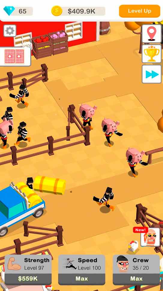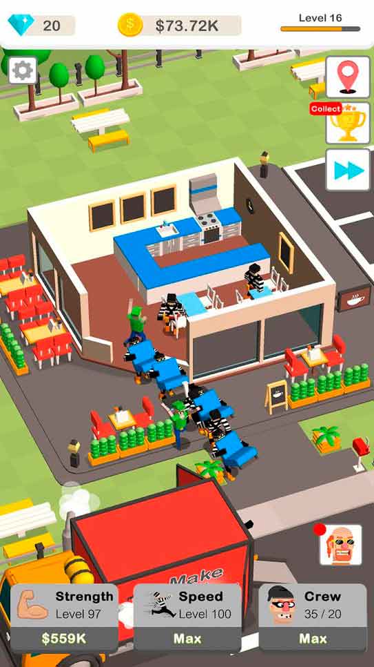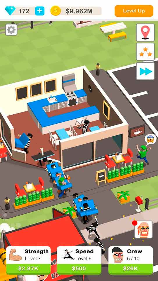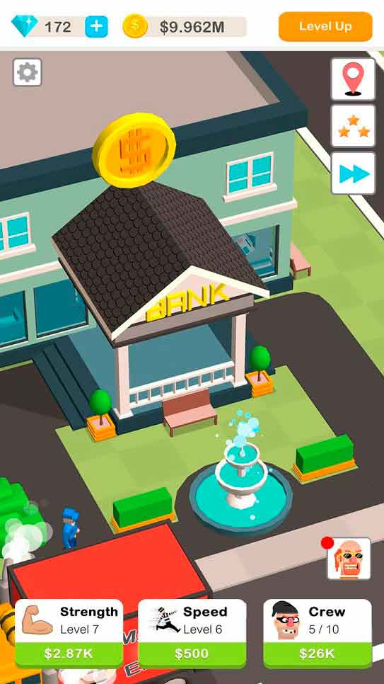 Idle Robbery – это забавный симулятор ограблений с характерной крупно пиксельной графикой и динамичными событиями. Ваша команда давно не выходила на дело, и вот пришло время это исправить. Отправляйтесь покорять очередной банк и постарайтесь унести из него как можно больше денег и при этом не попадитесь в лапы полиции. Успейте совершить ограбление века, и вы получите кучу очков и славу самого хитроумного преступника в этом удивительном виртуальном мире.