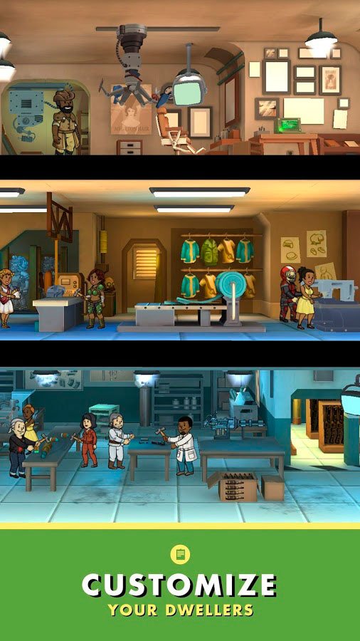 Fallout Shelter – это уникальное приложение для мобильных гаджетов, выполненное в стилистике популярнейшей игры. Здесь вы займетесь управлением просторным подземным убежищем со всеми его запутанными ходами и навороченным оборудованием. Восстанавливайте и улучшайте каждое помещение, чтобы все обитатели этого убежища чувствовали себя комфортно, переживая в нем глобальную катастрофу. С пустоши то и дело будут появляться проблемы, решение которых также ляжет на вас.