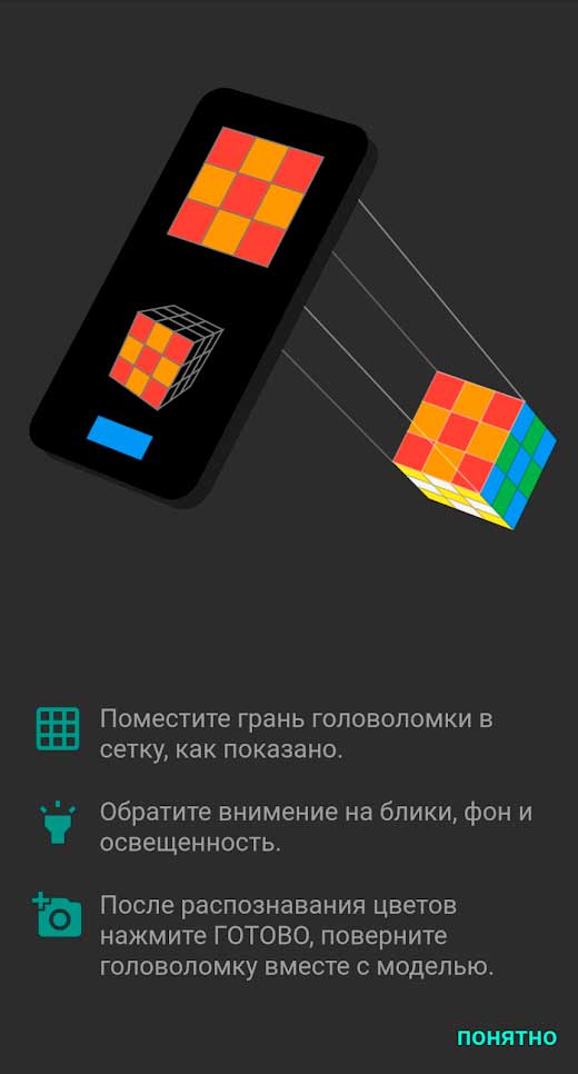 ASolver - решение головоломок – это оригинальное мобильное приложение, позволяющее решать головоломки с кубиком Рубика весьма эффективно. Тут собрано огромное множество хитрых загадок, решение которых может упростить данная программа. Обращаться с ней очень просто, так что даже ребенок разберется и сможет быстро решить любую из представленных задач. Достаточно поместить грань головоломки в электронную сетку, и приложение распознает цвета. Следите за освещенностью, фоном и отсутствием ярких бликов в кадре.